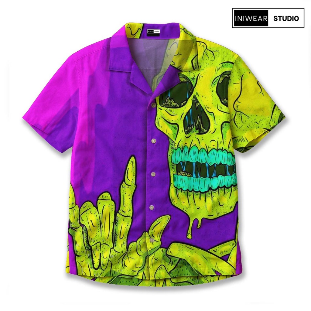 INIWEAR STUDIO Kemeja Tengkorak Neon Ungu Kuning – Kemeja Unisex Fullprint Streetwear Nyentrik | P0017