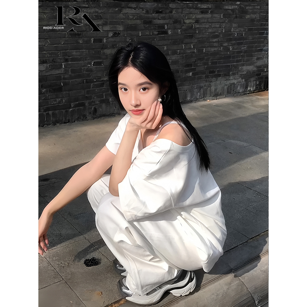RIOD AOER Y2K t-shirt atasan Pola bintang Kaos lengan pendek bahu miring cetak Amerika wanita musim panas 2025 baru retro kasual longgar