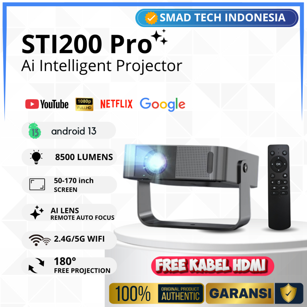 Smart Projector Ultra HD 1080P 8500 Lumens Electric Focus STI200Pro Bluetooth HDMI USB AV Audio AI Camera Android 12 Sup