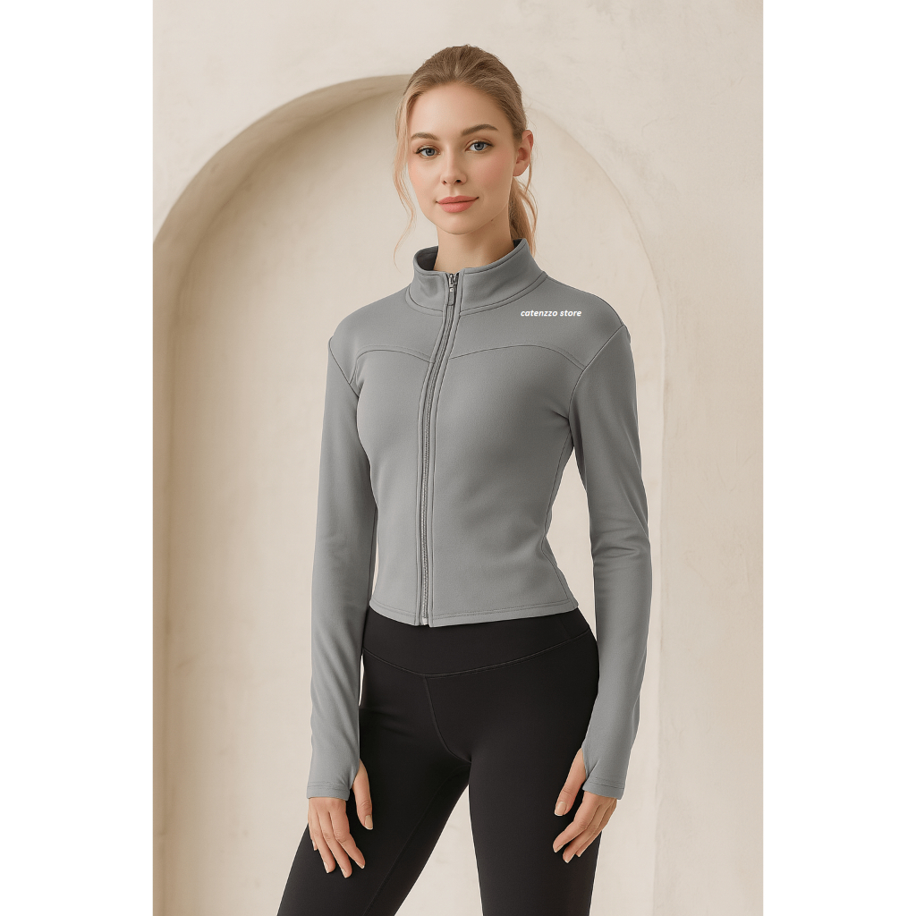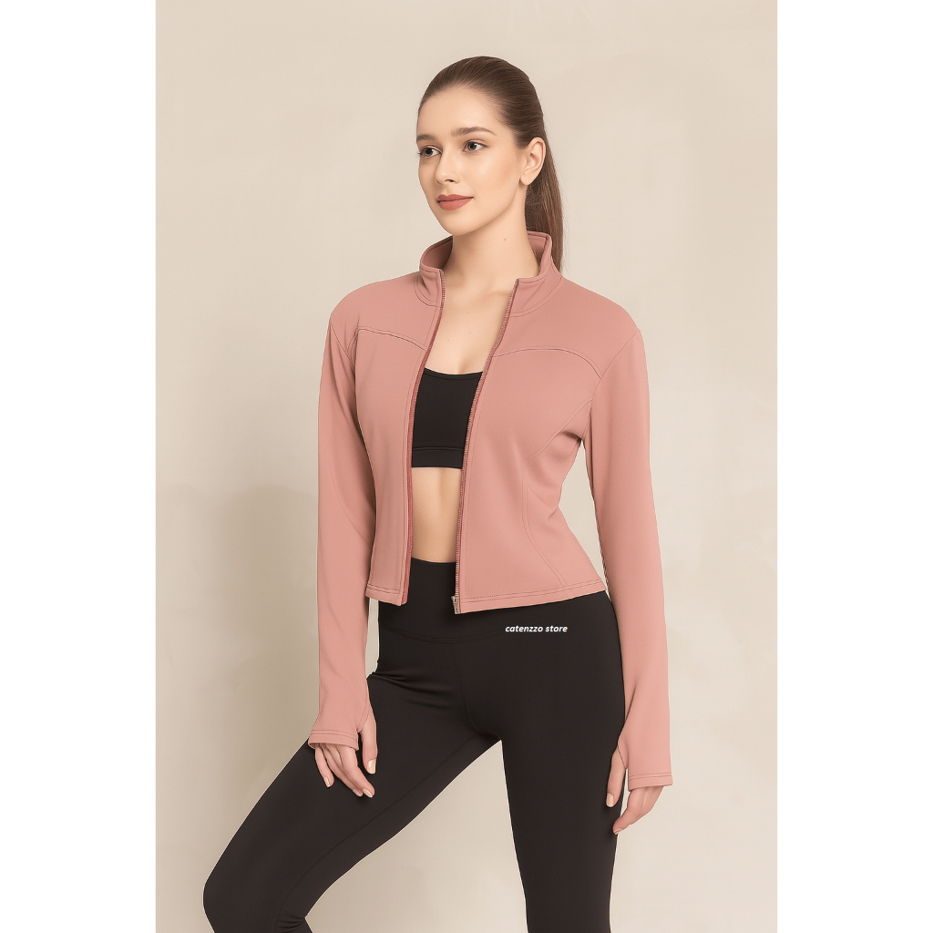 Jaket fitnes gym wanita Polos Lengan Panjang cepat kering dengan resleting yoga lari Anti UV