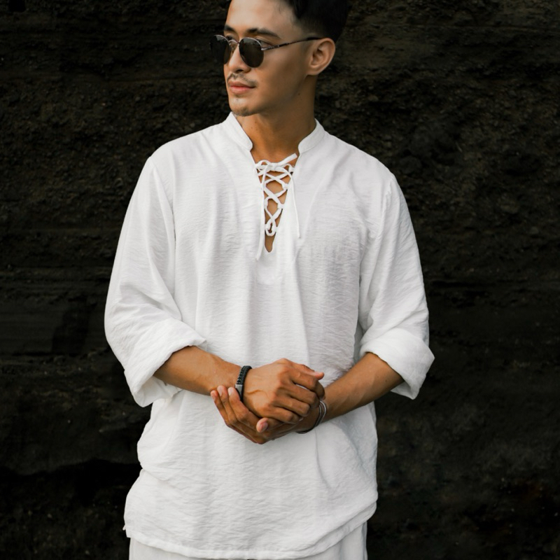 BEACHWELL Kemeja Atasan Pria Linen Kerah Bertali Putih Hitam Polos Premium Lengan Panjang Kasual - Polo Rope