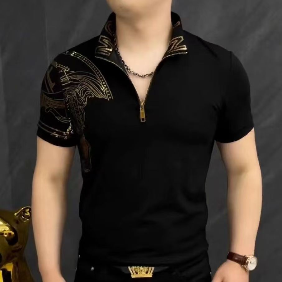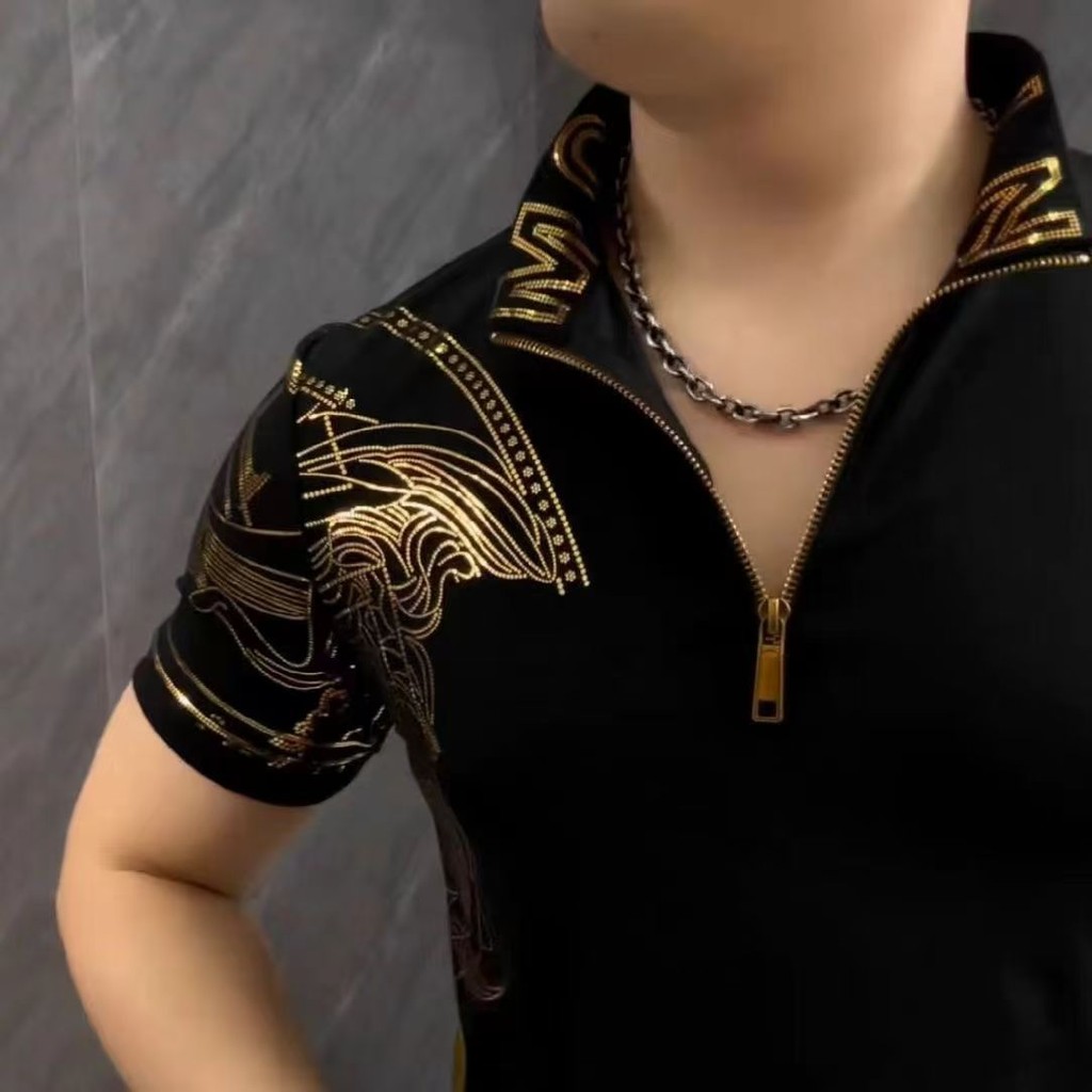 Kemeja Kerah Foil Emas Fashion Musim Panas Pria POLO Sweatshirt Lengan Pendek Stretch