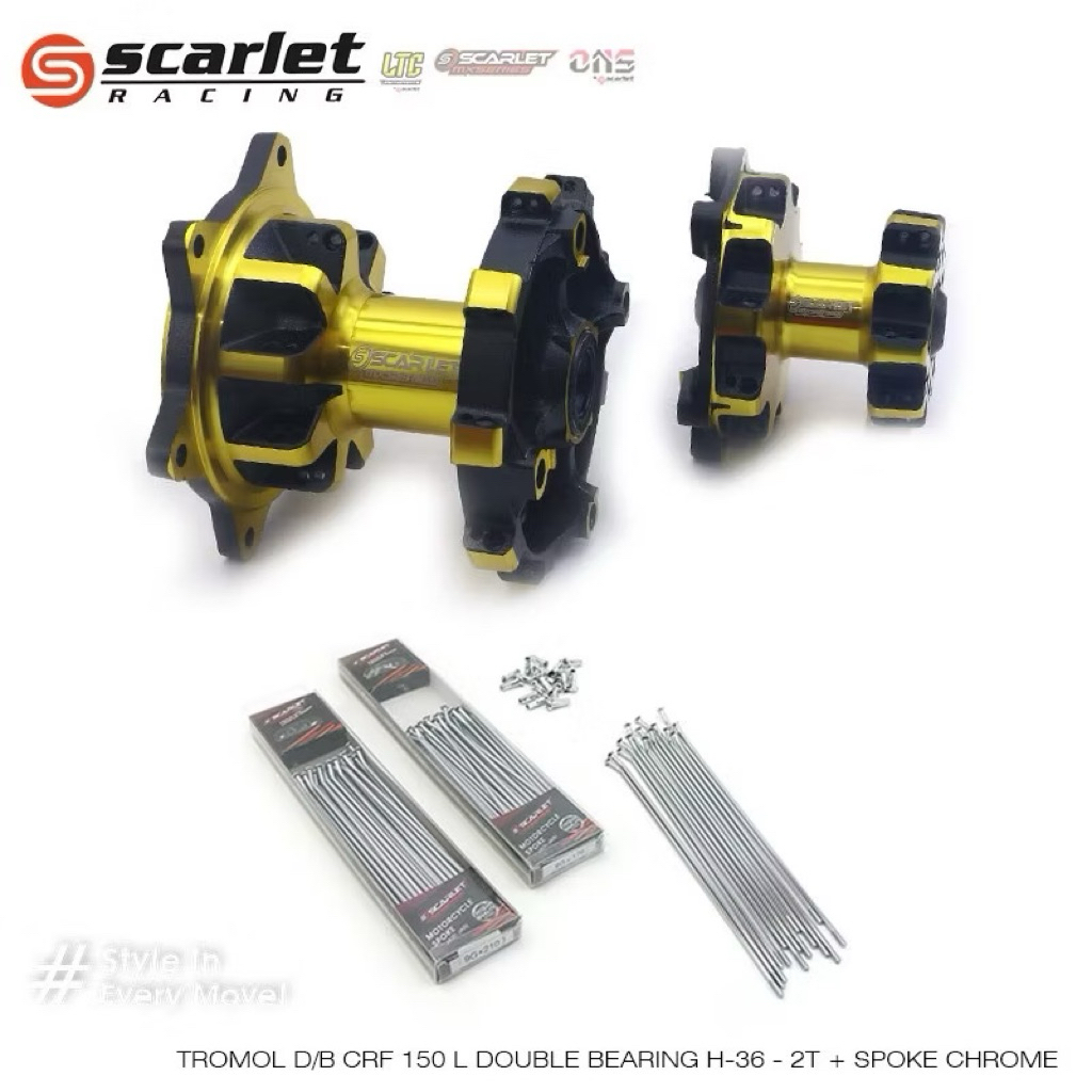 Scarlet Racing - Tromol Trombol Hub Trail Depan Belakang Set 2 Tone Crf 36 Hole Double Bearing + Jari Jari Chrome R 17