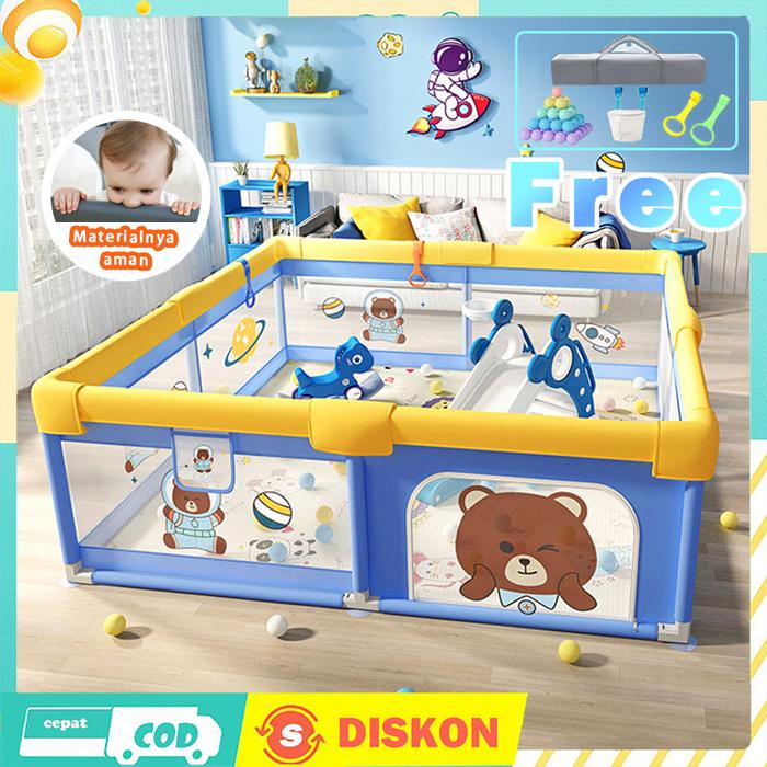 READY STOCK BABY PLAYFENCE PAGAR KOLAM TEMPAT MAIN BERMAIN MANDI BOLA BAYI ANAK BABY SAFE FENCE PLAYPEN PLAYMAT PLAYING FENCE PLAY PEN PVC GRATIS RUMAH - BIRU KUNING+GIFT, 2.0×1.8M