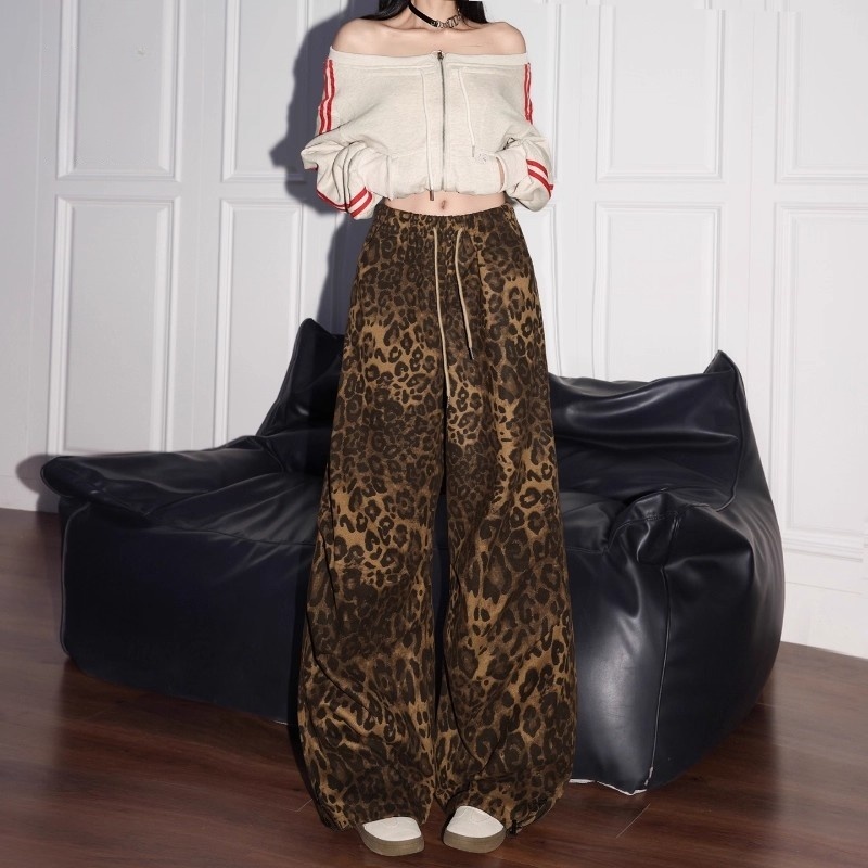 Veegirl Celana Wanita Motif Leopard Kekinian High Waist Tali Serut Model Longgar dan Nyaman