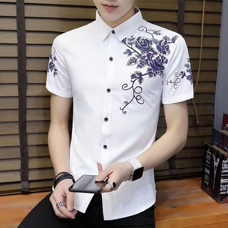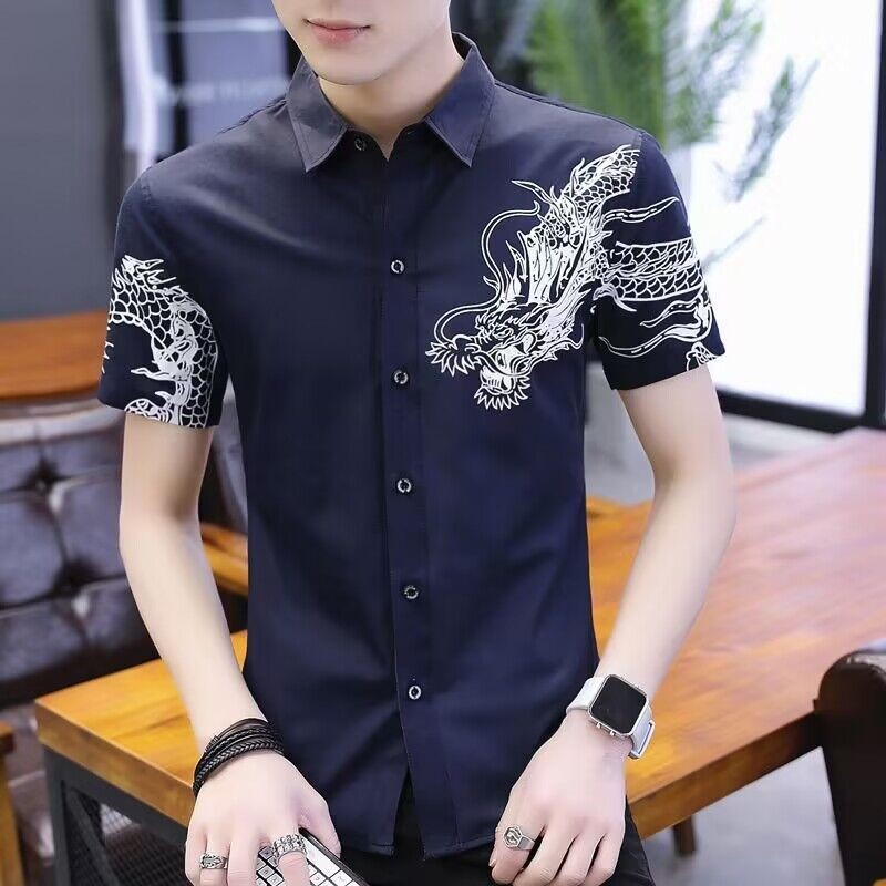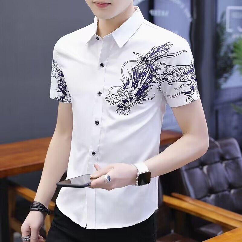 Kemeja Motif Pria Lengan Pendek Putih, Atasan Motif Naga Tampan, Pakaian Pria Kasual Setengah Lengan