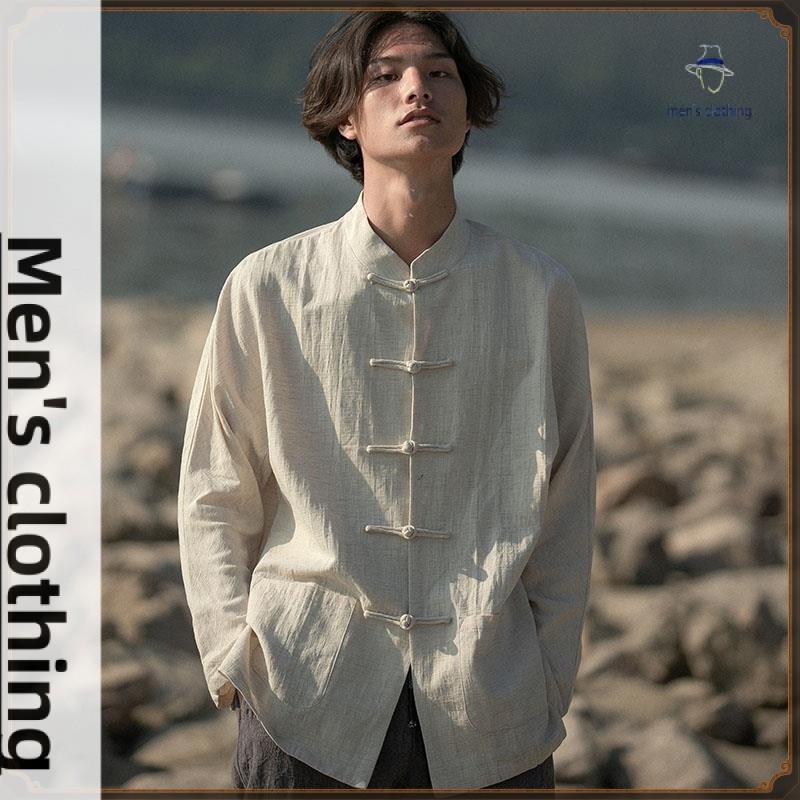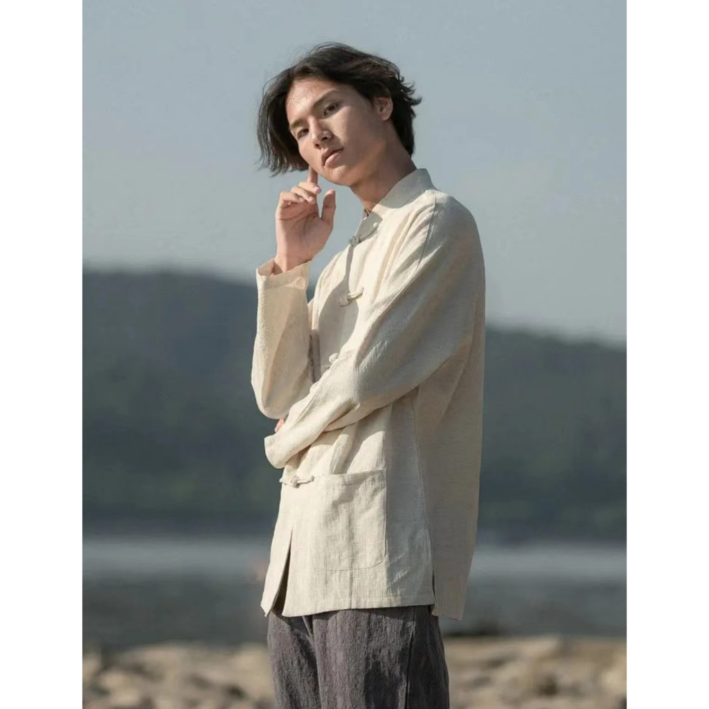 #Tang Suit Men's FashionYouth Linen Shirt Long Sleeve Cotton and Linen Stand CollarZhongshanShirt