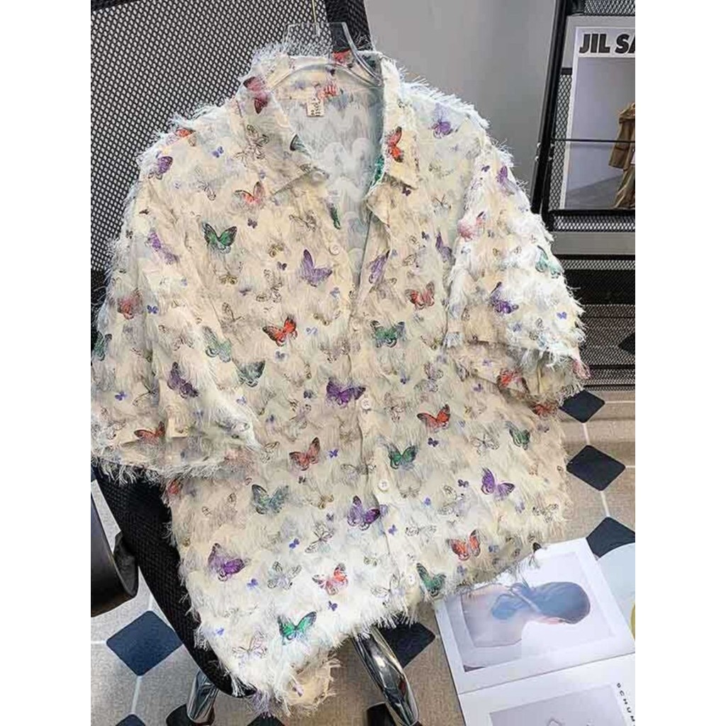 Thin Butterfly Short-Sleeved Shirt Men's Frayed Trendy Hong Kong Style Shirt