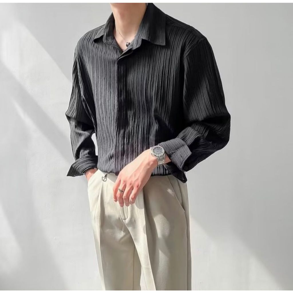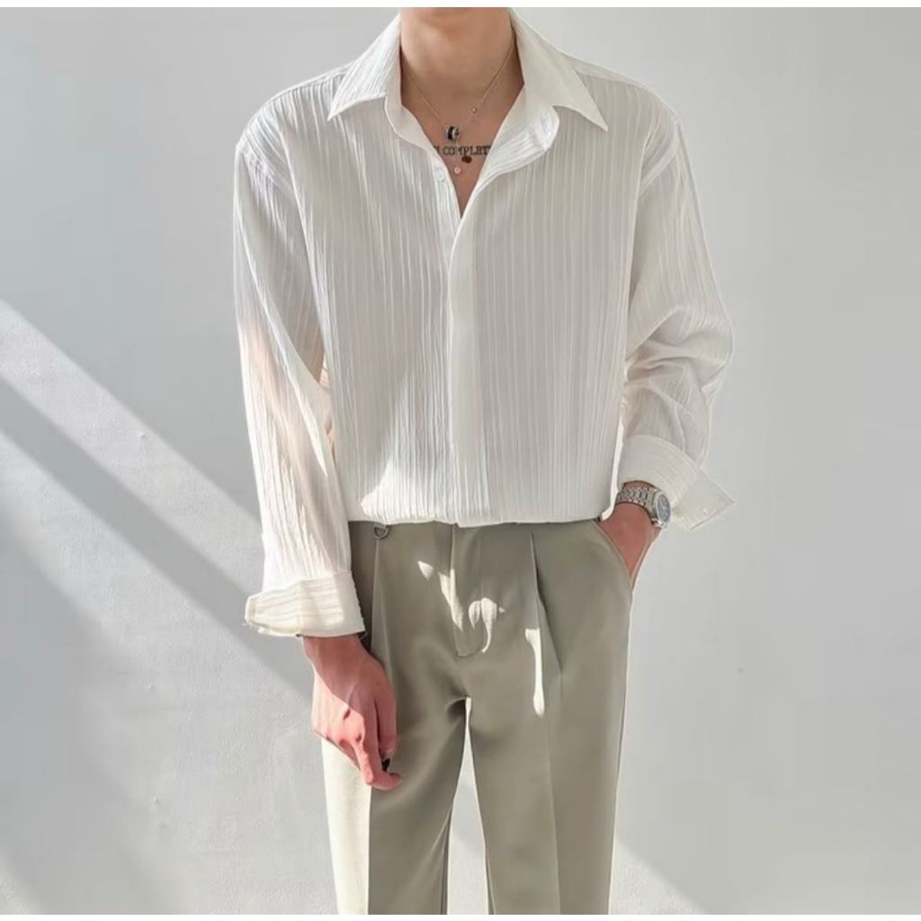 Kemeja Lengan Panjang Bahan Linen Korean Style Street Style Warna Hitam Putih Pria