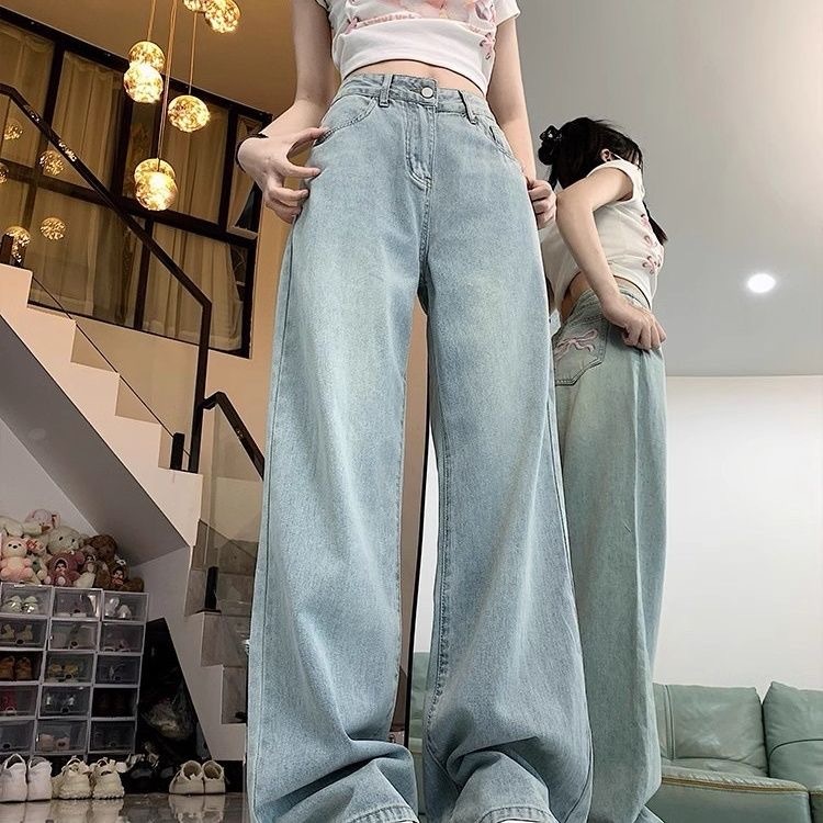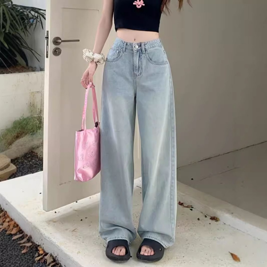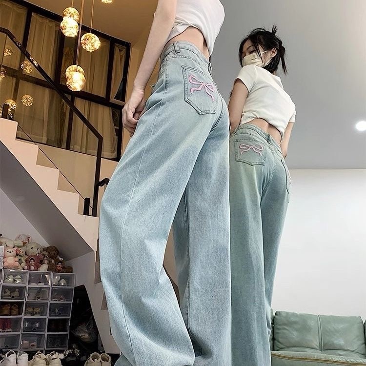 YURUMA Celana Jeans Korea Sulaman Pita, High-waist Wide-leg, Efek Langsing