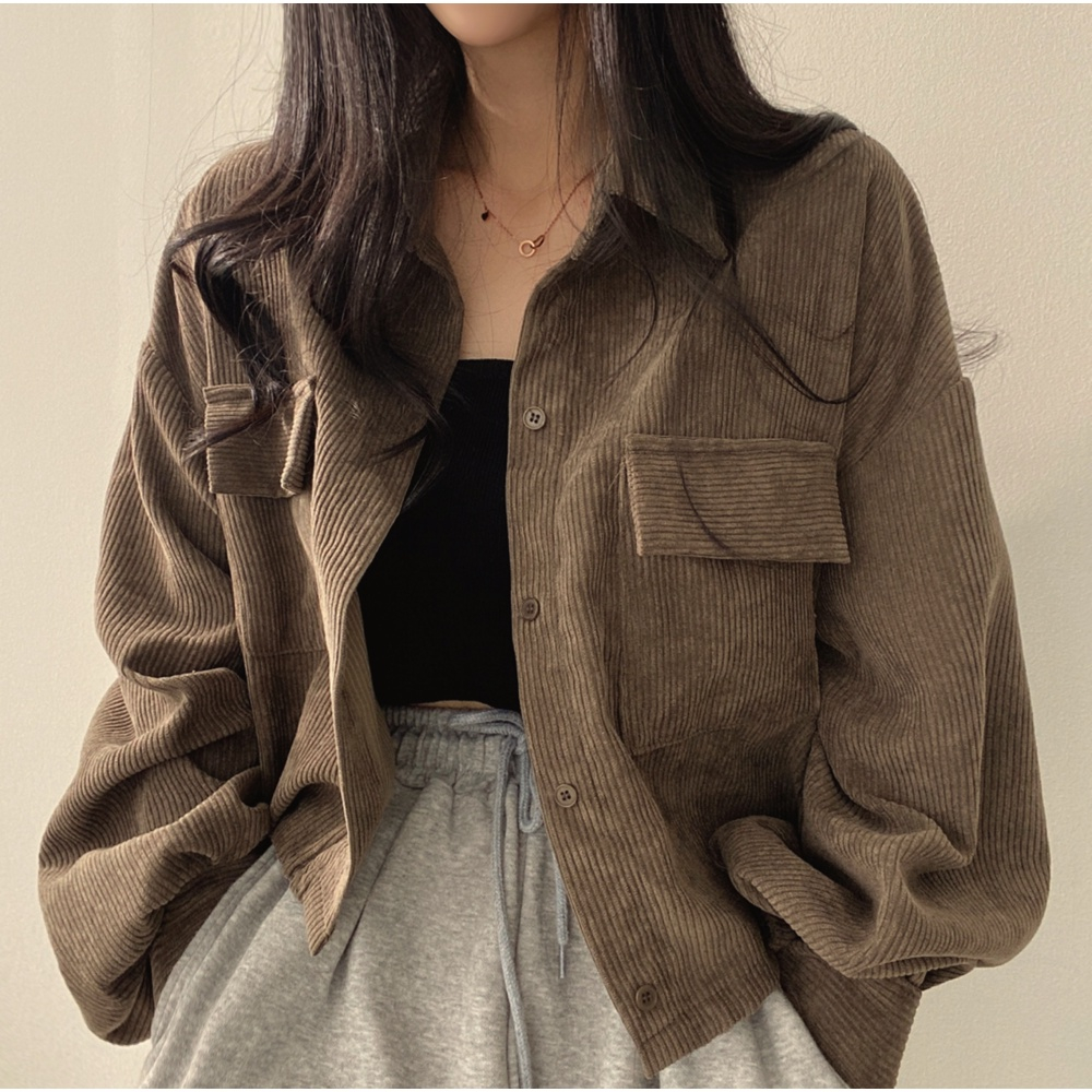 jaket korduroi pendek retro wanita warna solid atasan korea style