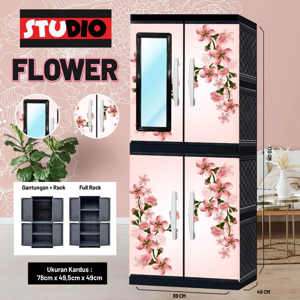 STUDIO Lemari Pakaian Plastik 2 Pintu Jumbo Motif Bunga Printing VIP GANTUNG + KACA