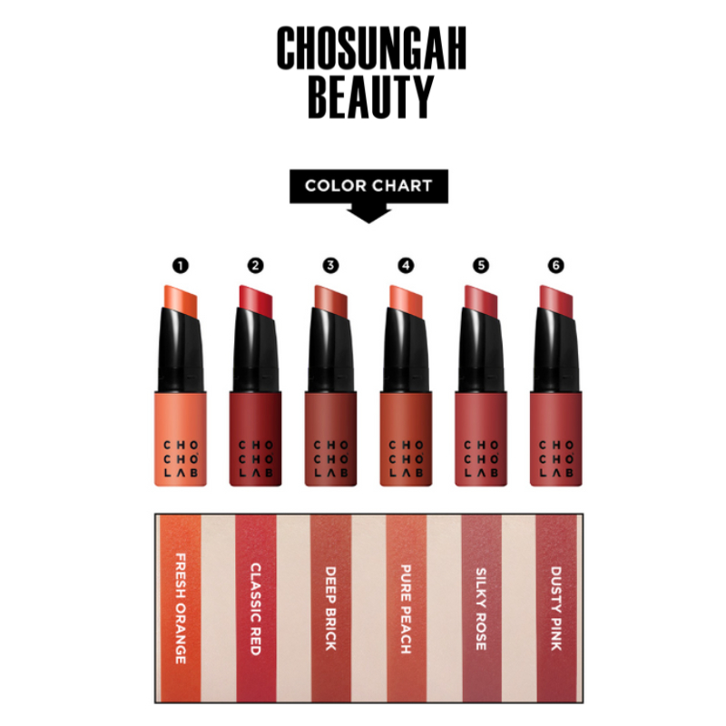 01 Fresh Orange, 02 Classic Red, 03 Deep Brick, 04 Pure Peach, 05 y Rose, 06 Dusty Pink