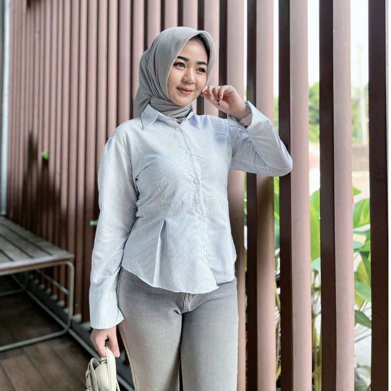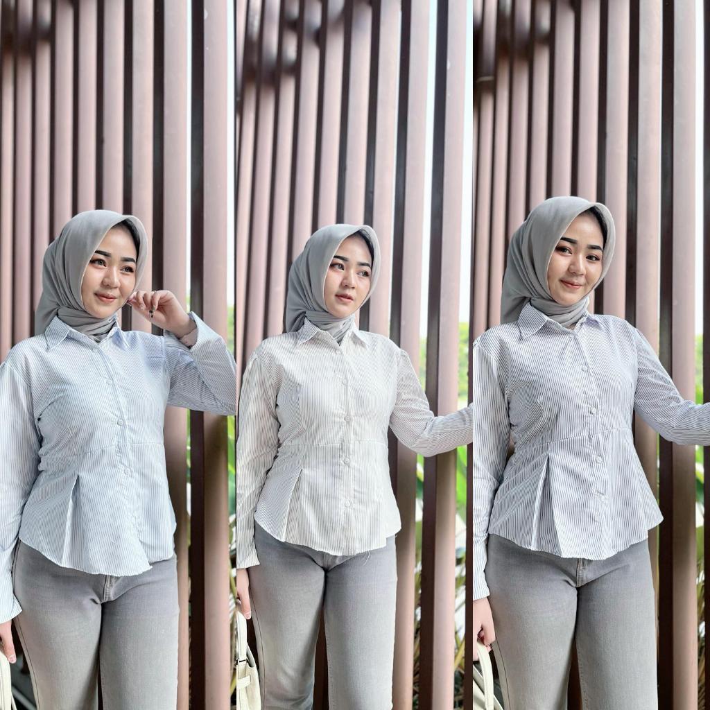 Kemeja Stripe Rempel Fit Body Wanita Casual Daily Formal - Kemeja Stripe Rempel Korean Look Fitted Shirt - Atasan Wanita Stripe Salur - Kemeja Wanita Kantor