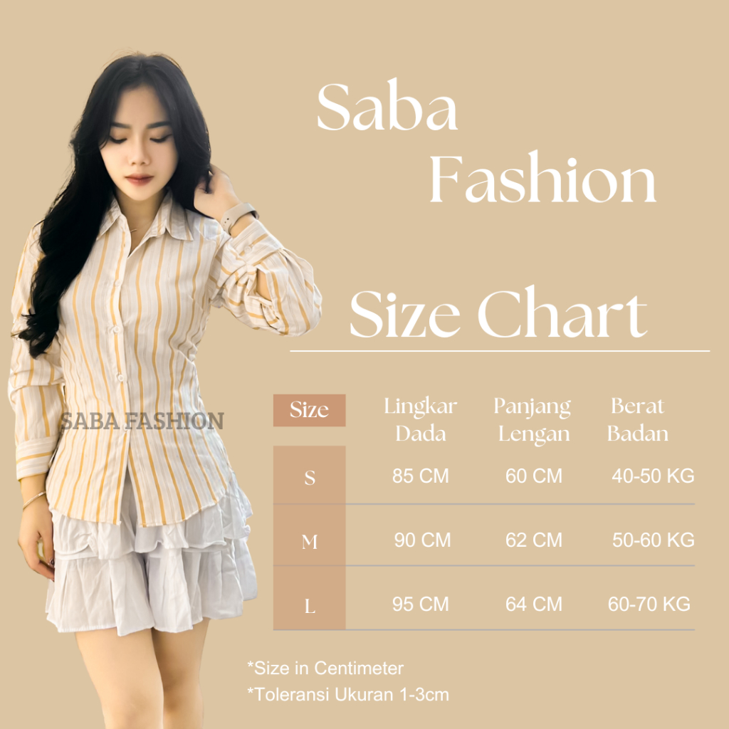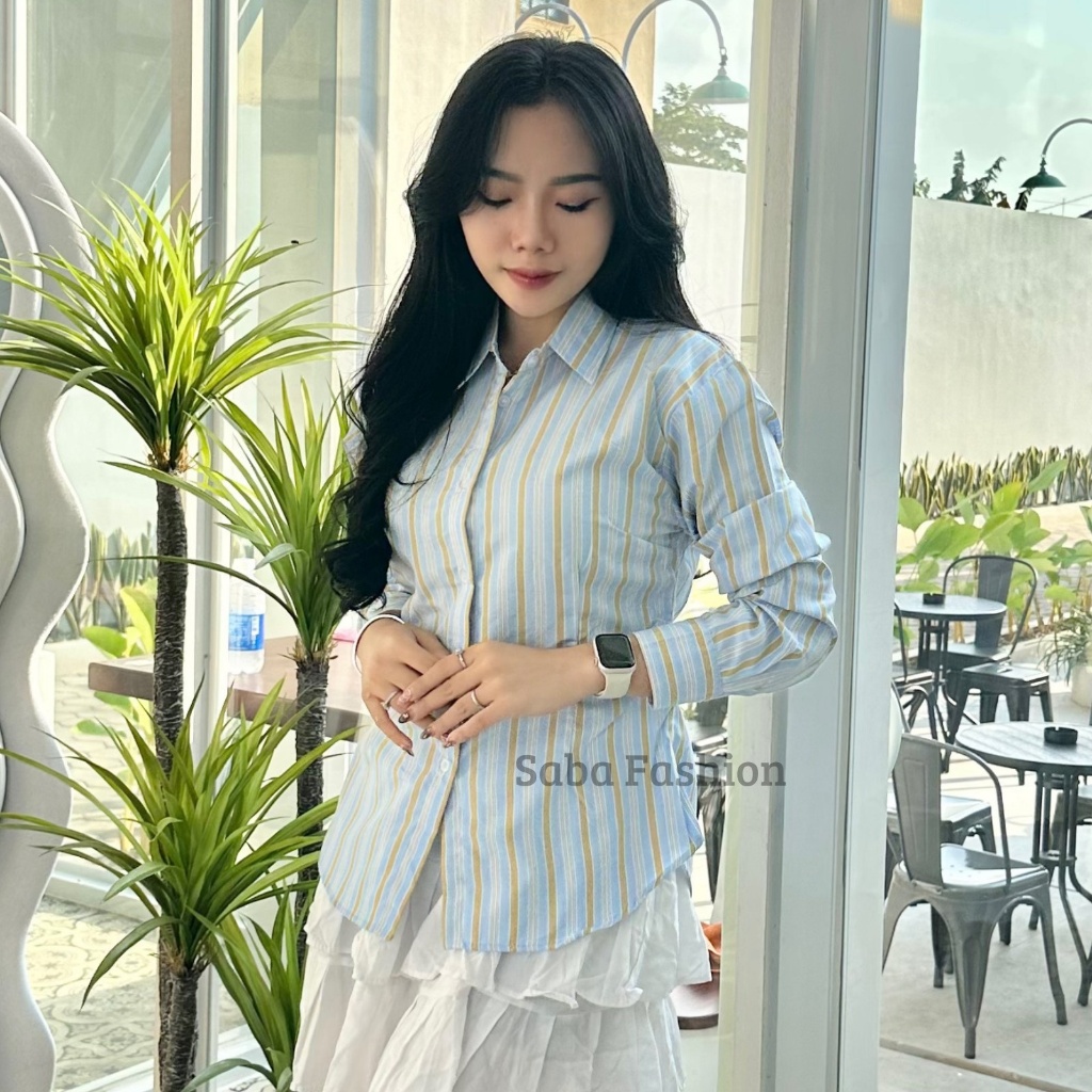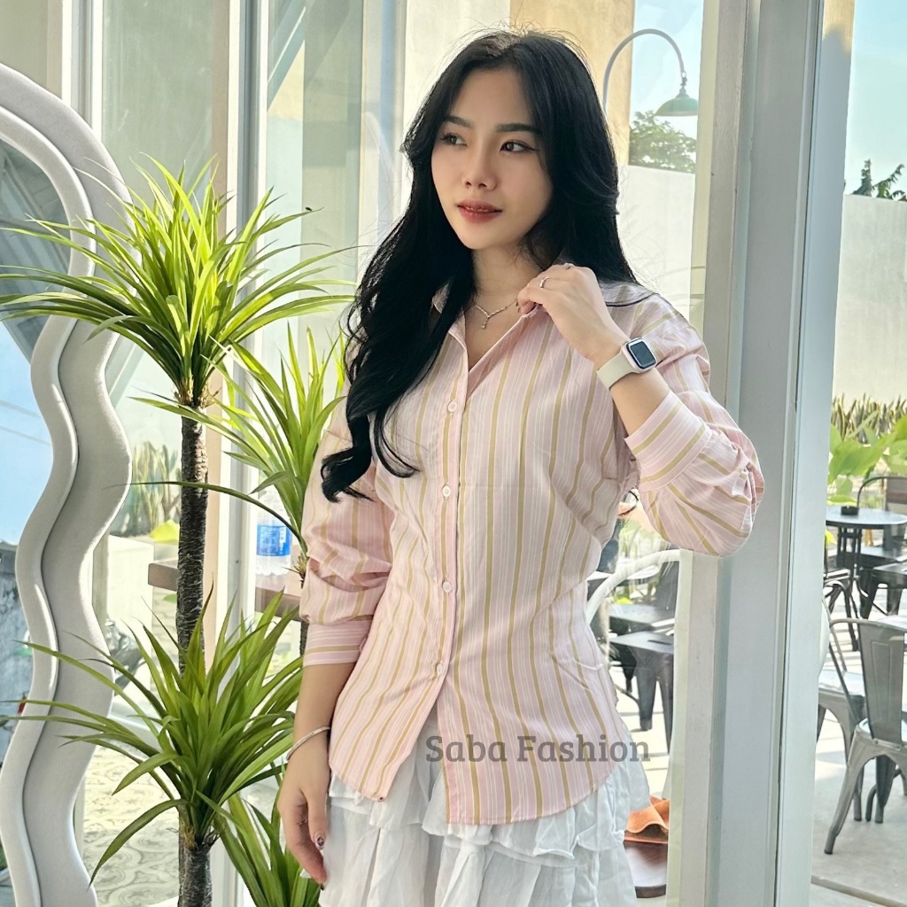 Kemeja Kerja Wanita Fit Garis Stripe Karet | Kemeja Salur Press Body Viral By Saba Fashion