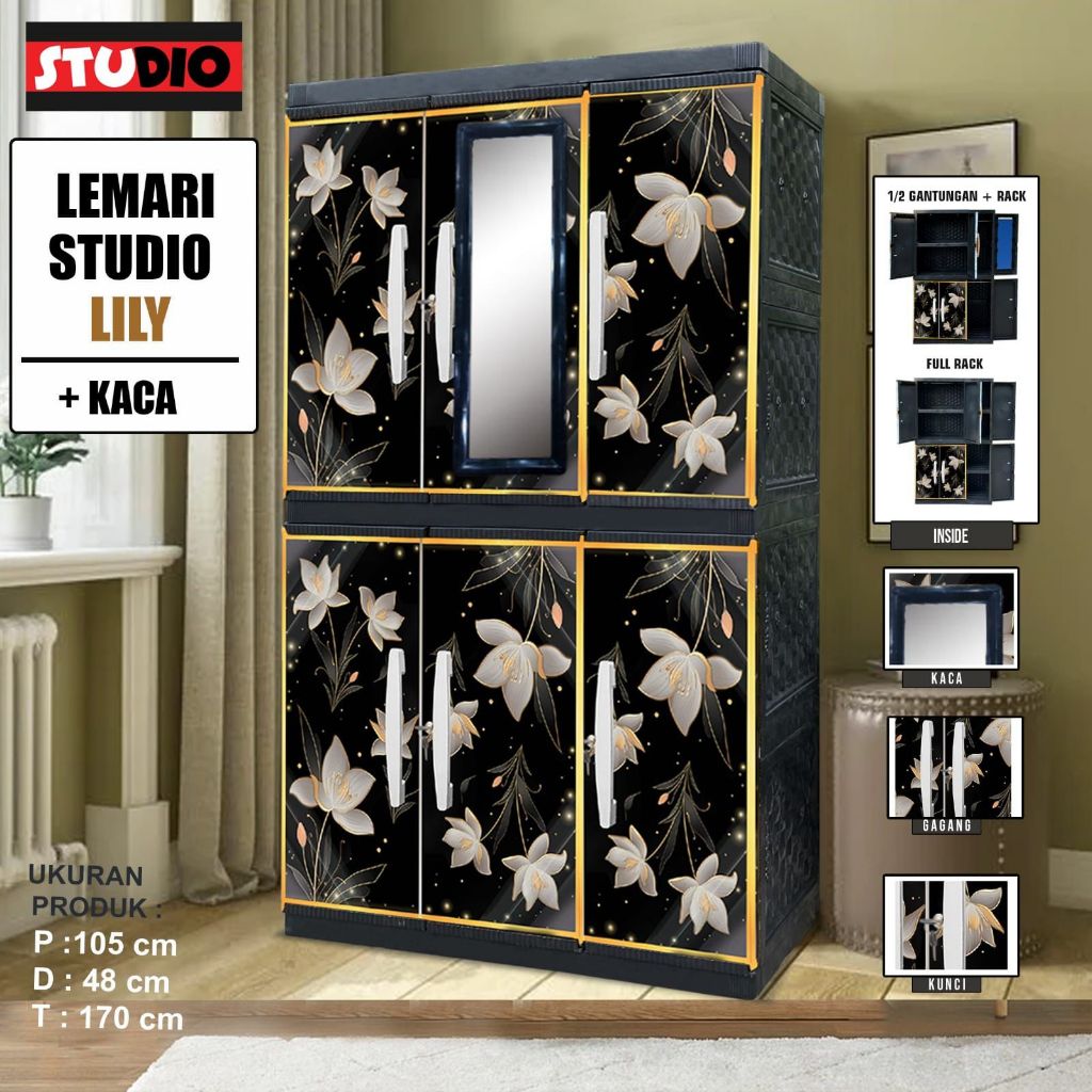 STUDIO LEMARI PAKAIAN PLASTIK KACA 3 PINTU JUMBO MOTIF PRINTING