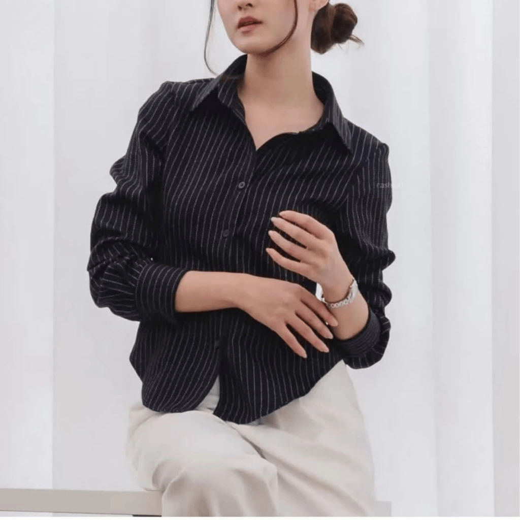 Kemeja Stripe Wanita Fitted Lengan Panjang Kantor Semiwol Motif Garis