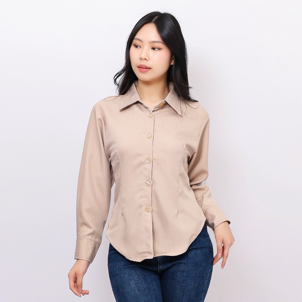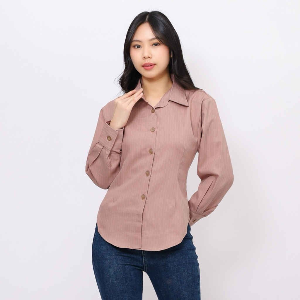 Elton Stripe Fitted Shirt - Kemeja Ngantor Salur Wanita - Atasan Semi Woll - Kemeja Fitted