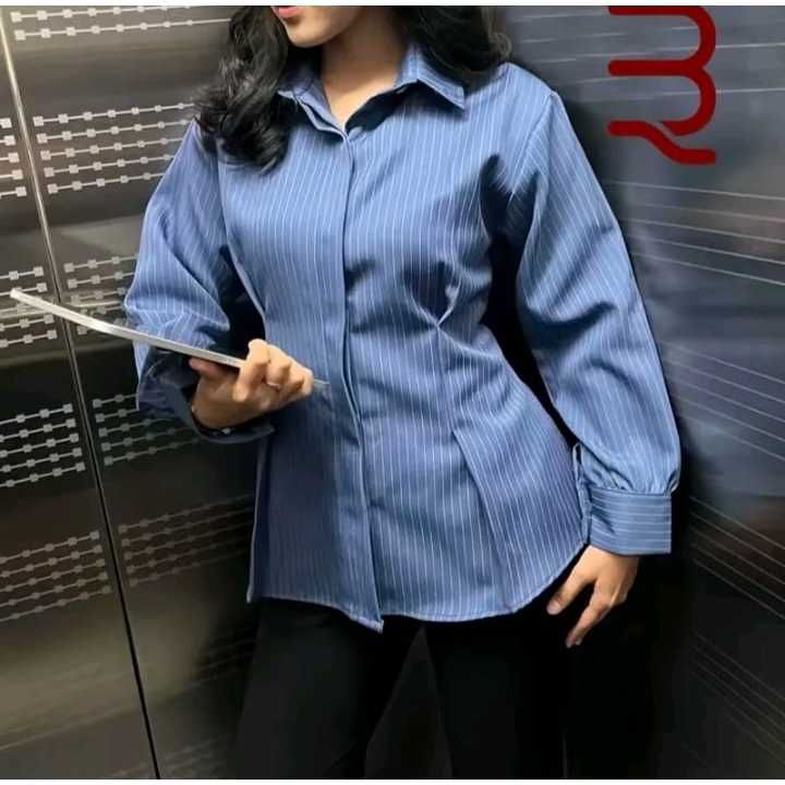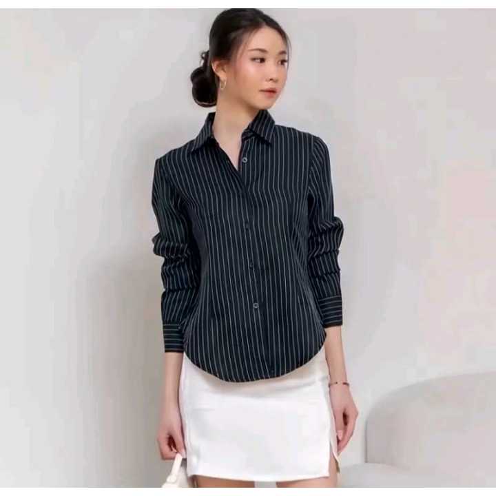 Kemeja Wanita Lengan Panjang Slim Fit Strip Salur