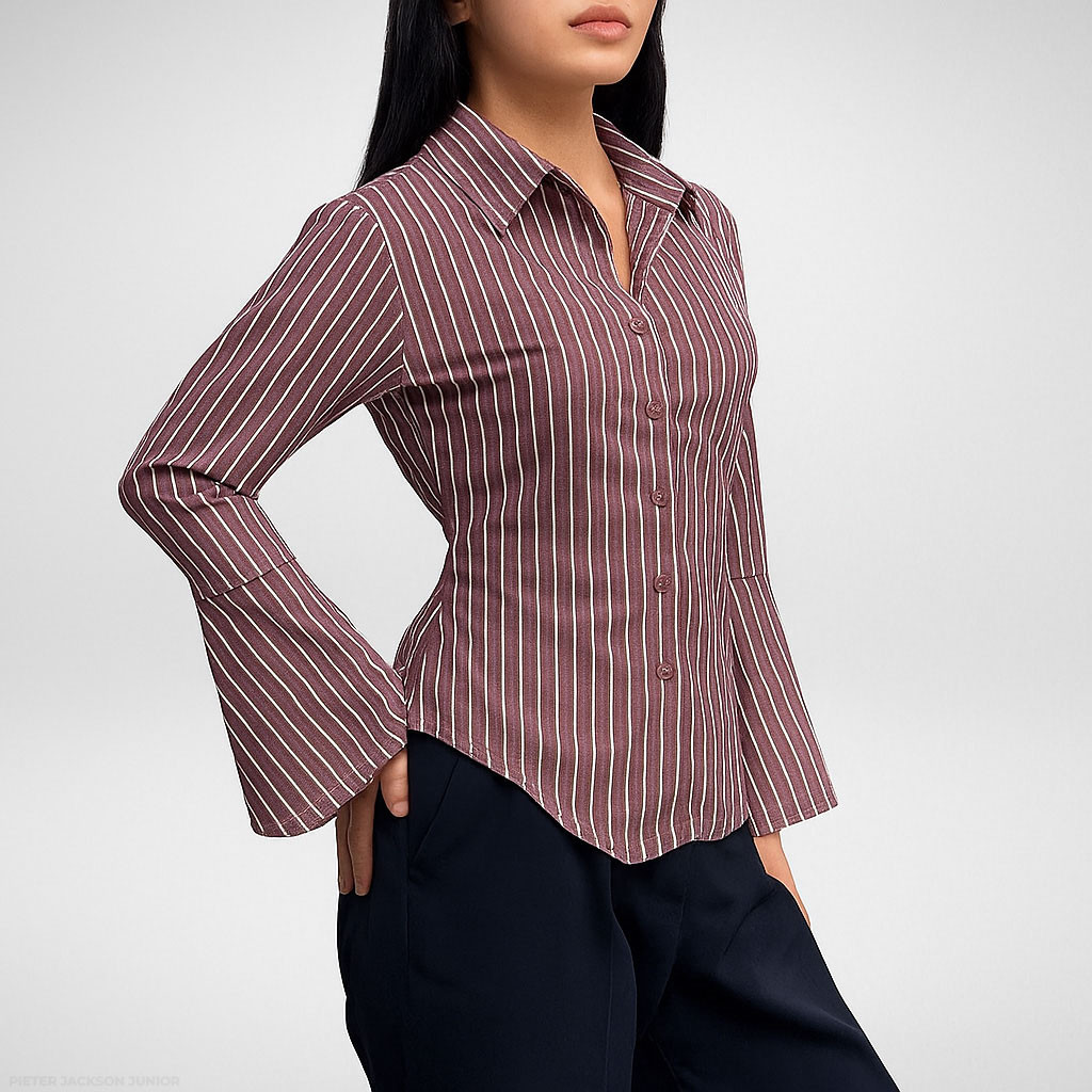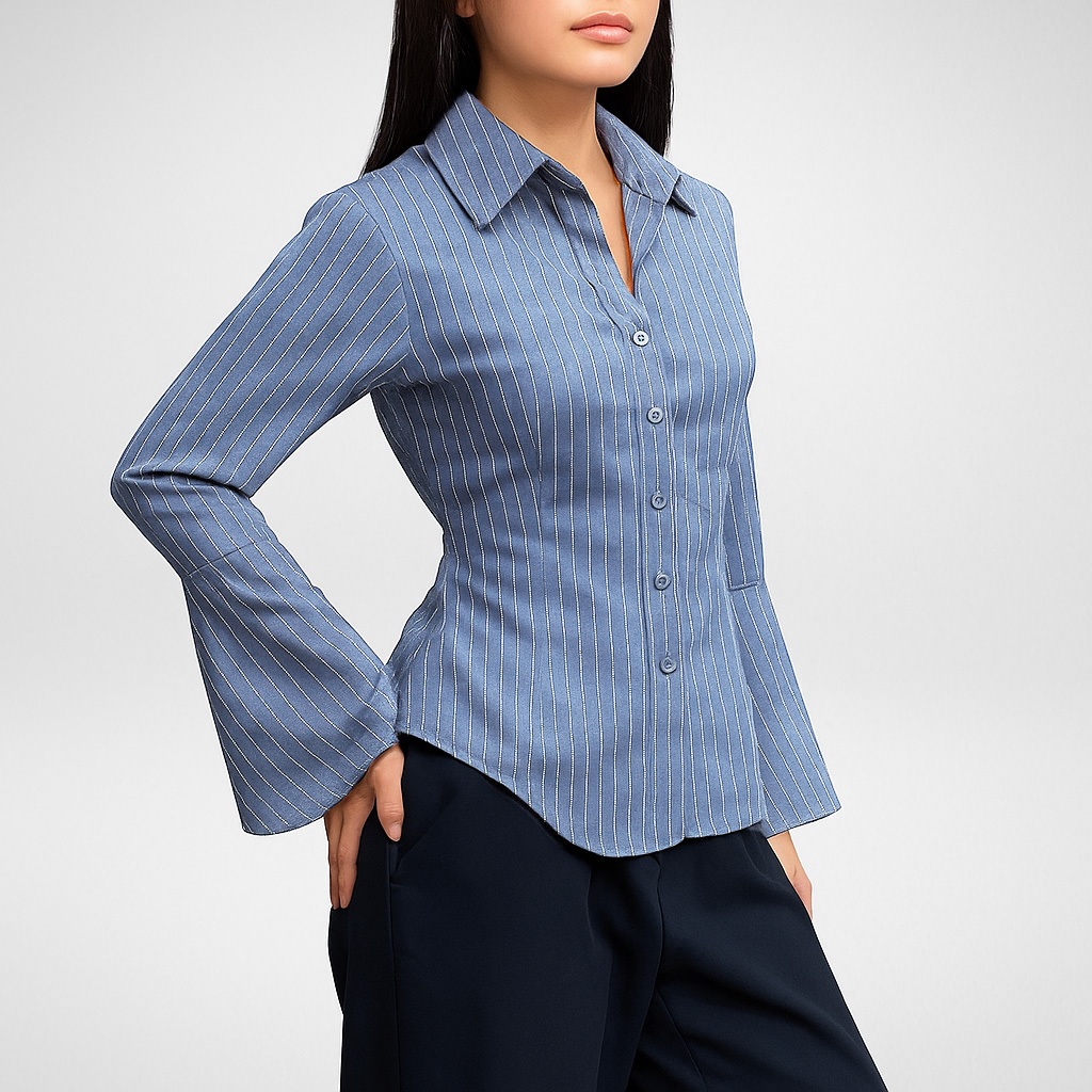 Kemeja Wanita Salur Stripe Shirt Fitted Basic Casual Atasan Lengan Panjang Formal Fit And Flair