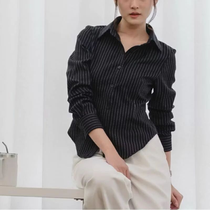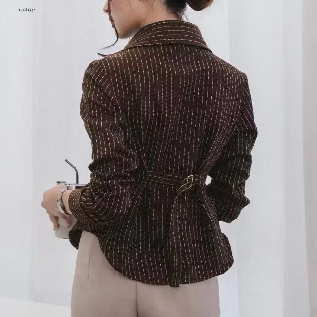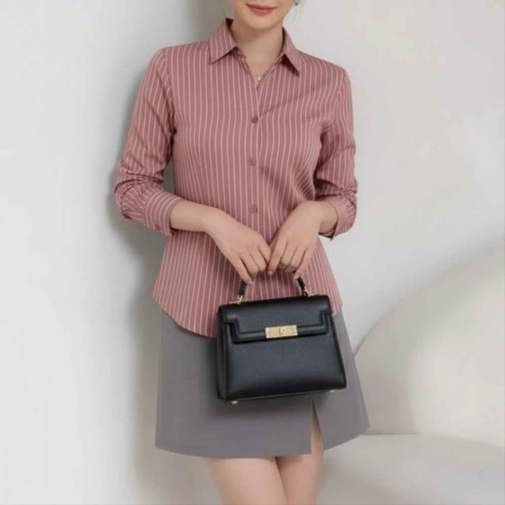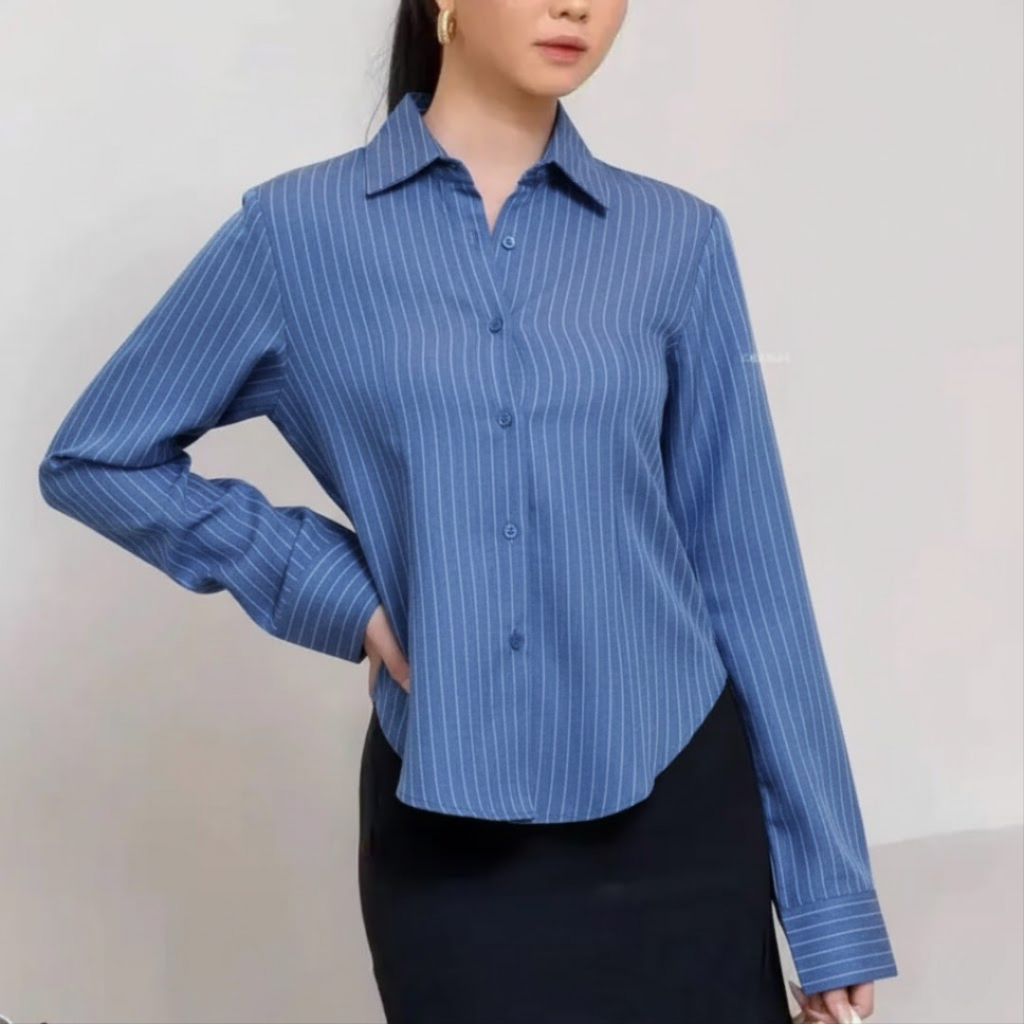 Luna Stripe Kemeja Fitted Premium - Kemeja Wanita Salur Garis Casual - Kemeja Wanita Lengan Panjang Terbaru - Atasan Basic Semi Woll - Kemeja Kerja Wanita Slim Fit Body