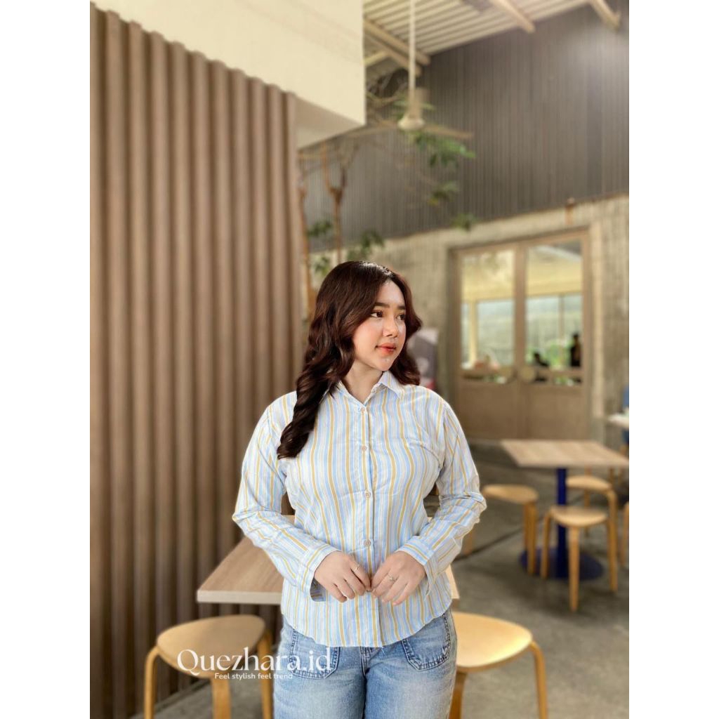 MONNEY Fitted Shirt Kemeja Wanita Slimfit Kemeja Katun Motif Stripe