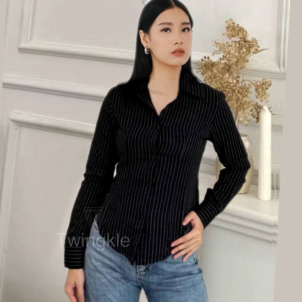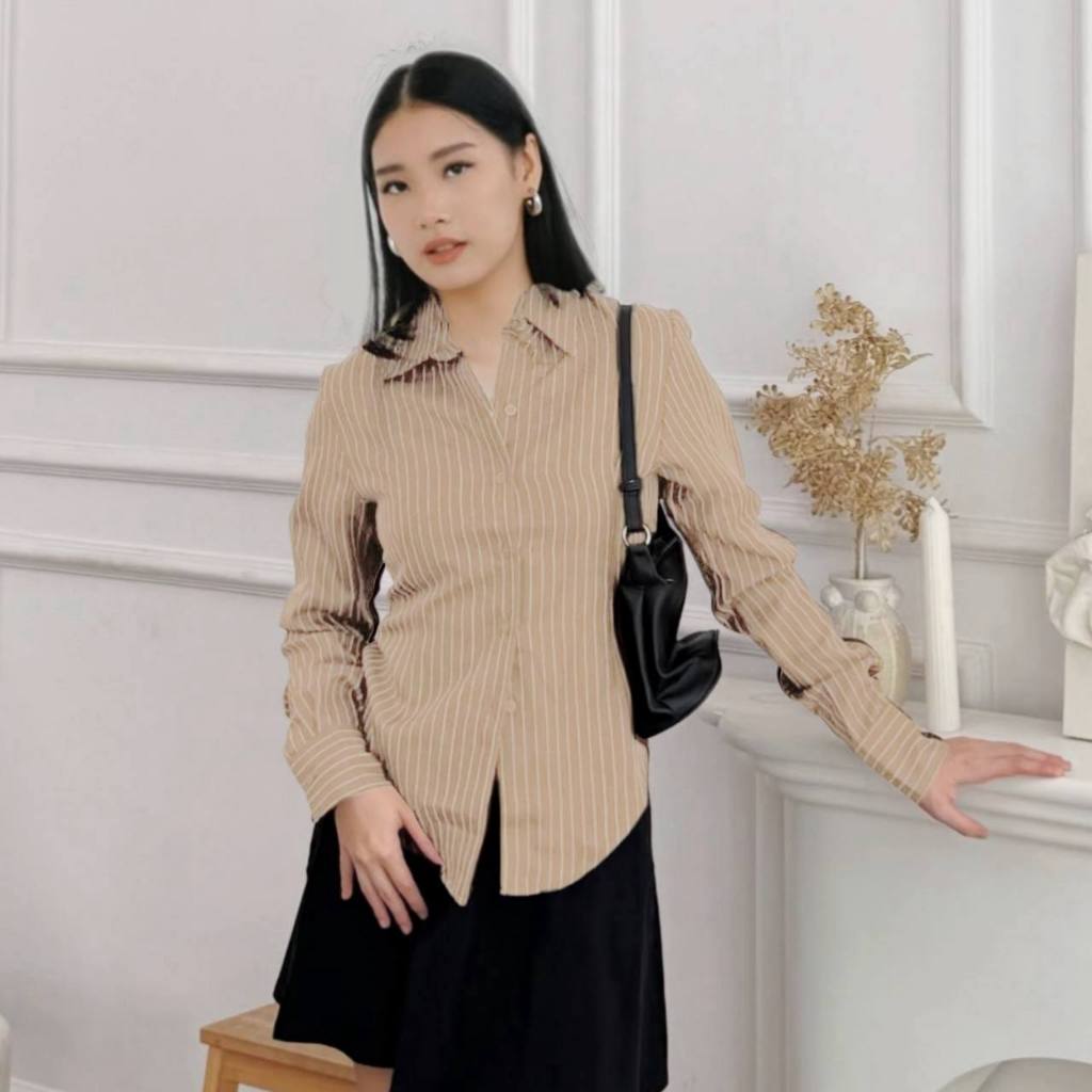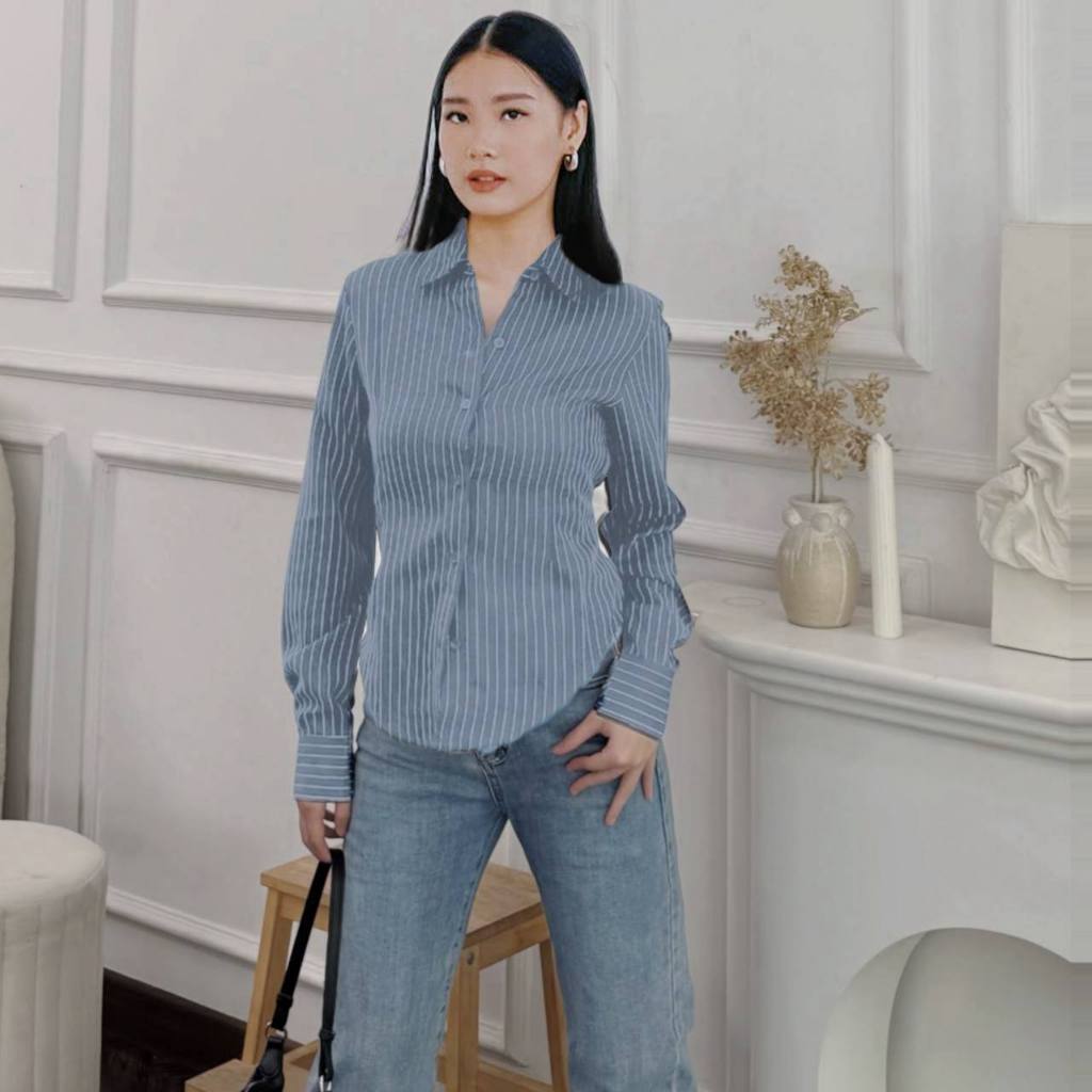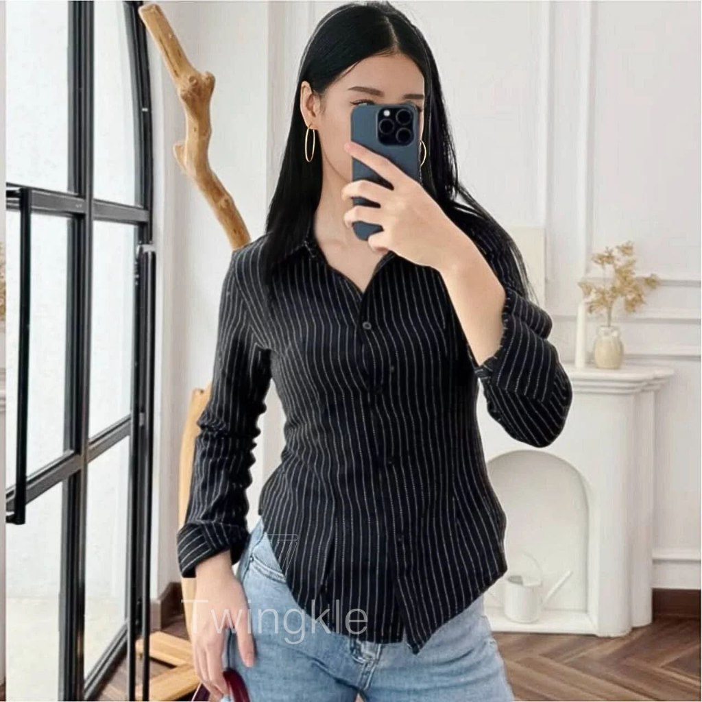 TWINGKLE ELSI Stripe Kemeja fitted Wanita Kerja Kantoran Kuliah Basic Casual Atasan Lengan Panjang