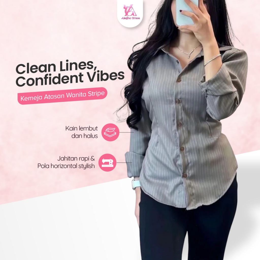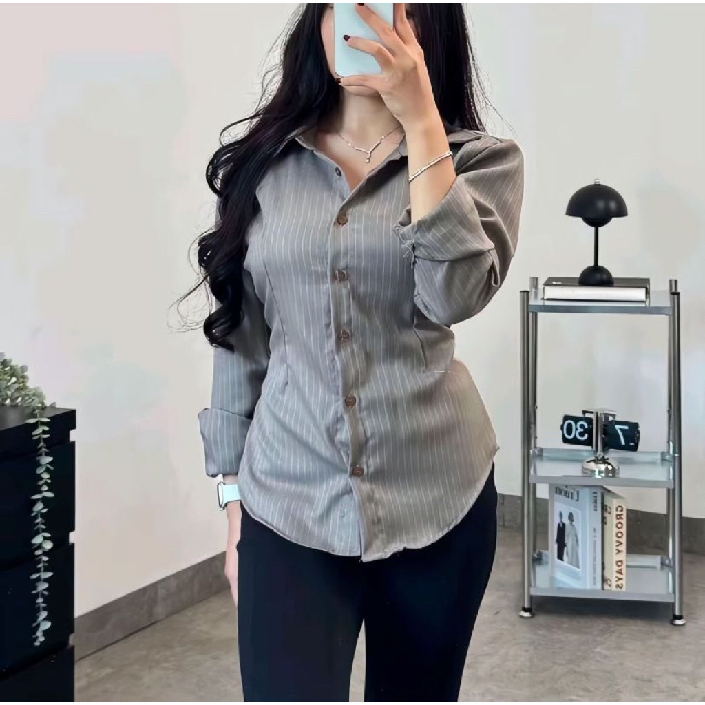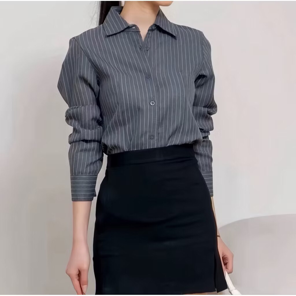 Kemeja Atasan Wanita Motif Salur Garis Stripe Slim Fit Body – Lengan Flare Elegan, Kekinian Feminim