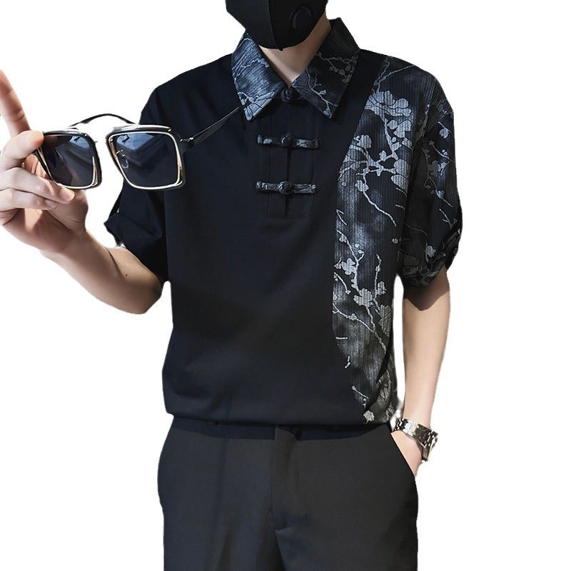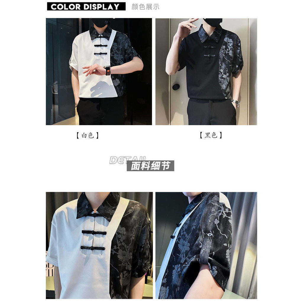 Baju Lengan Setengah Panjang Pria, Baju Lengan Setengah Warna Kontras Bergaya China Baru
