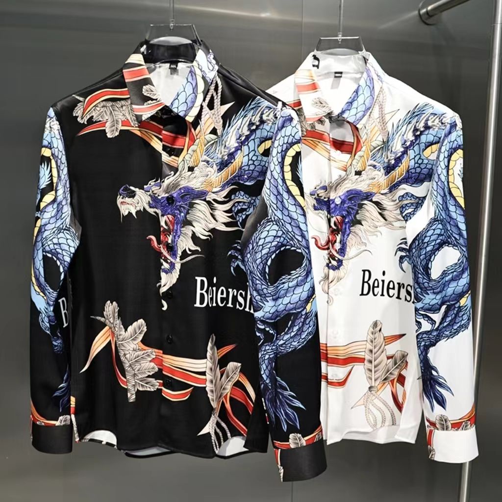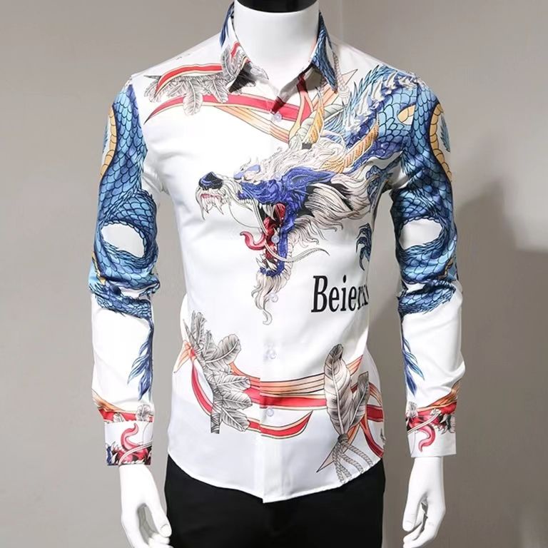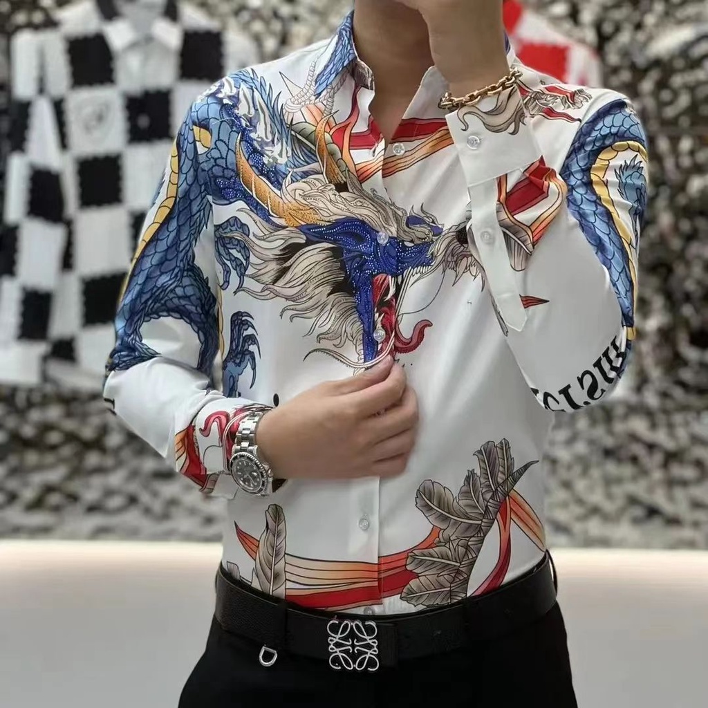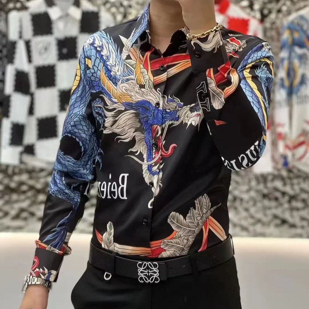 Men's shirt early spring printed hot diamond men's high-end shirt dragon pattern shirt