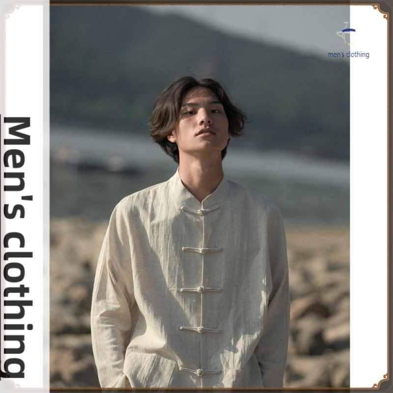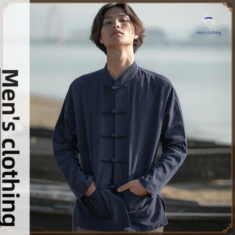 #Tang Suit Men's FashionYouth Linen Shirt Long Sleeve Cotton and Linen Stand CollarZhongshanShirt