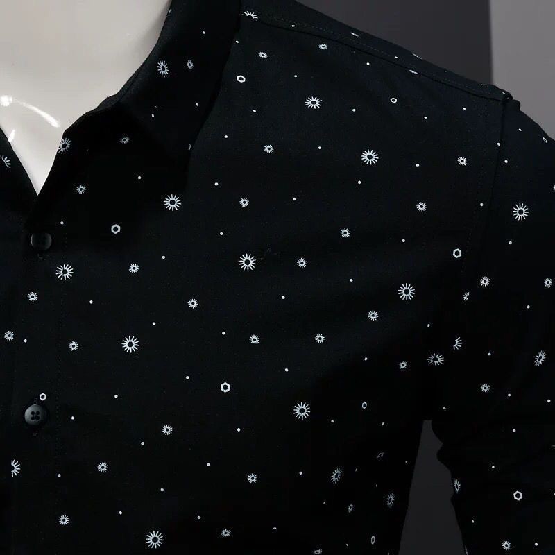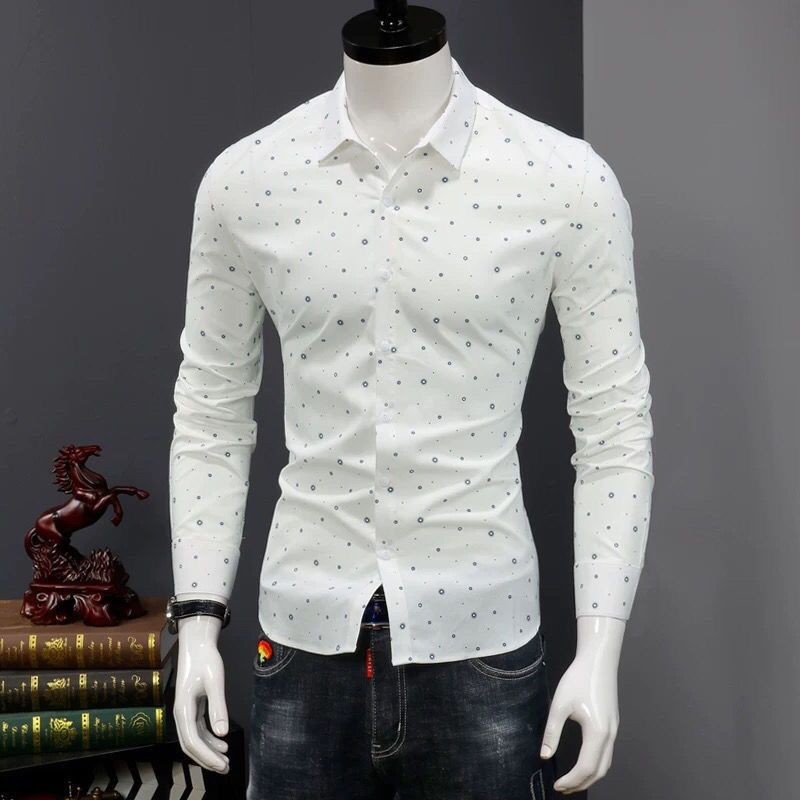 Kemeja Pria Lengan Panjang Slim-Fit,Tampan Pemuda Korea Pakaian Pria Trendi Kemeja Polkadot