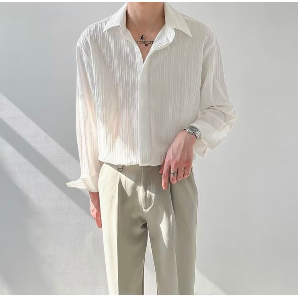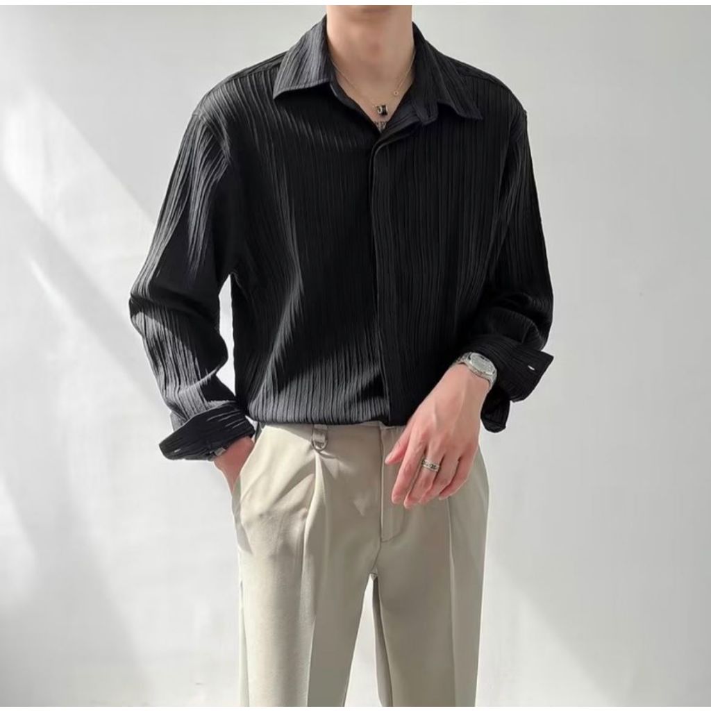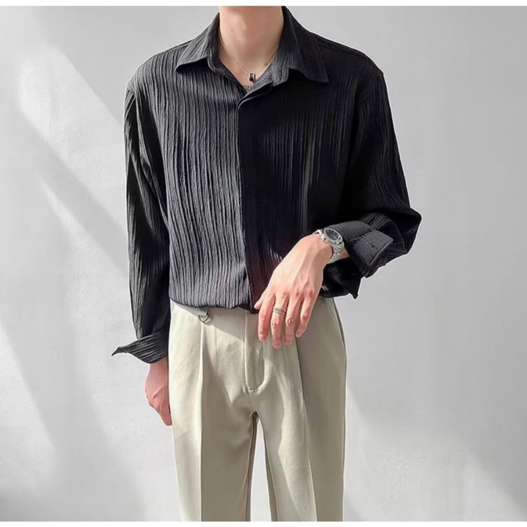 Kemeja Lengan Panjang Bahan Linen Korean Style Street Style Warna Hitam Putih Pria