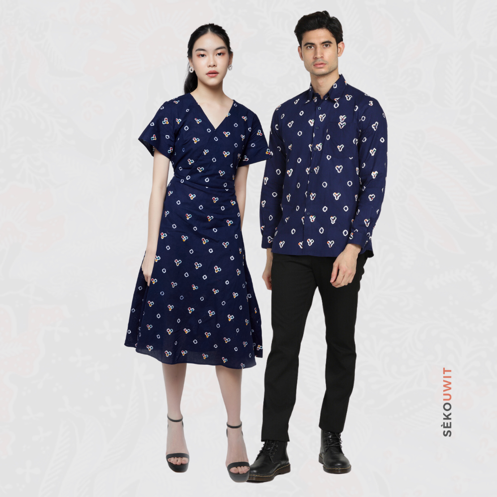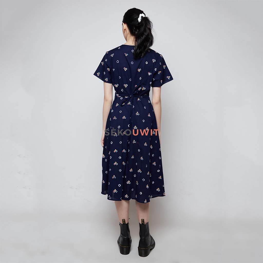 Fressia Jumputan Midi Wrap Dress / Dress Batik Midi Biru Navy Sekouwit