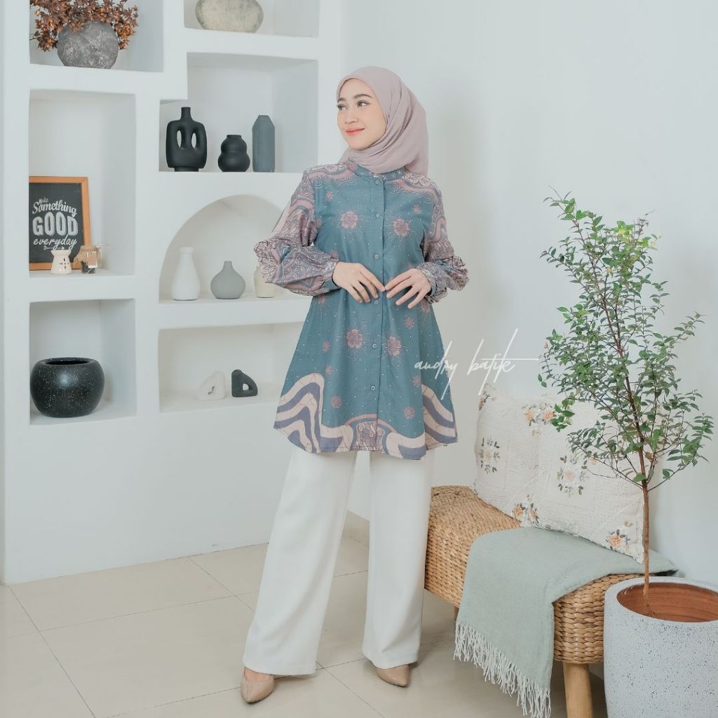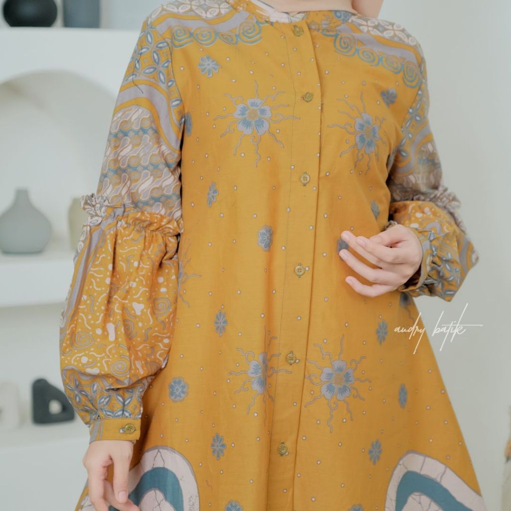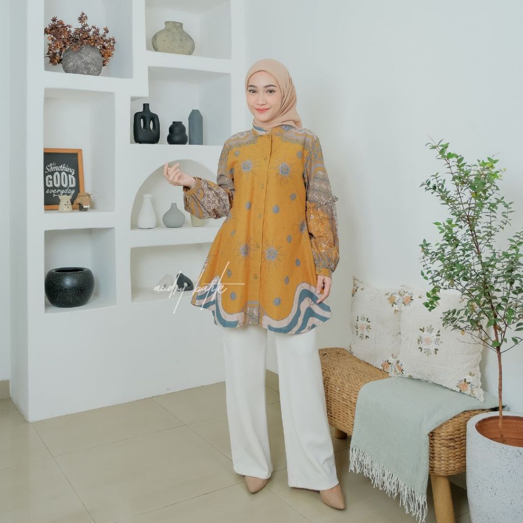 Audry Batik - Maharani - Blouse Batik Kerja Wanita Panjang Hijab Modern Kawung Bunga Mustard Tosca