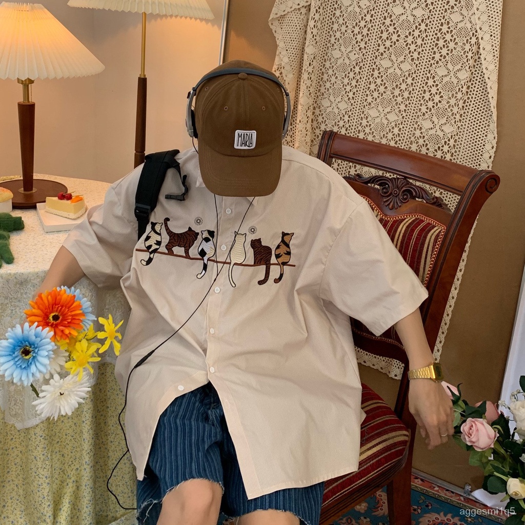 ##Garis-garis kucing bordir retro lengan pendek kemeja pria retro Hong Kong gaya atasan pasangan malas