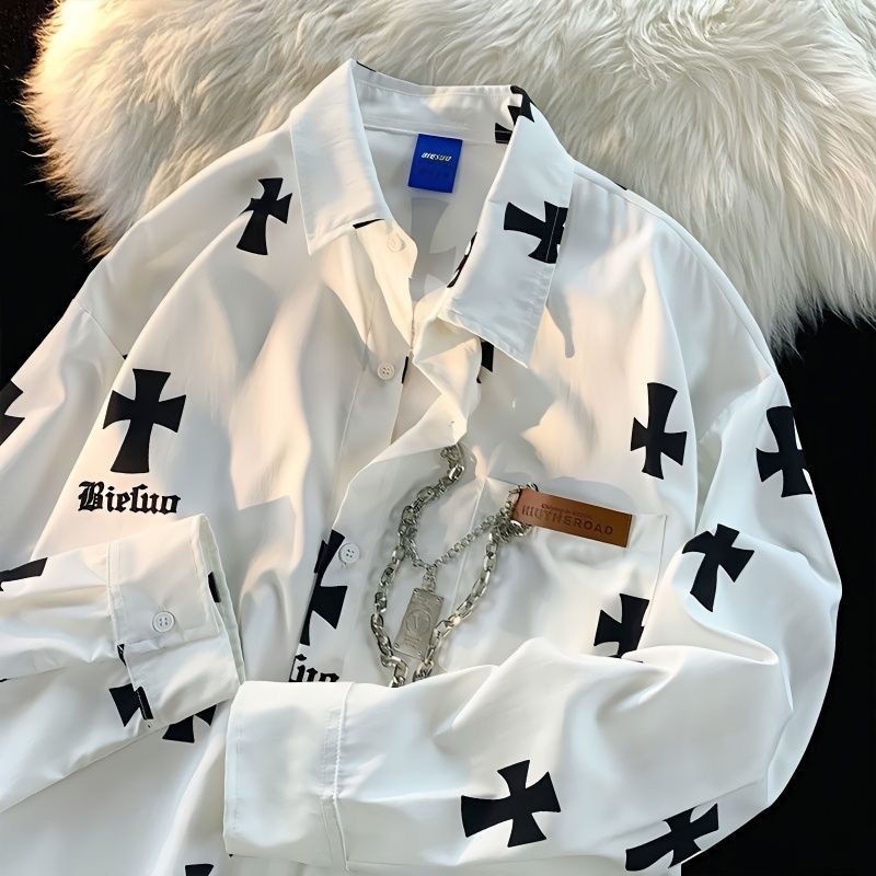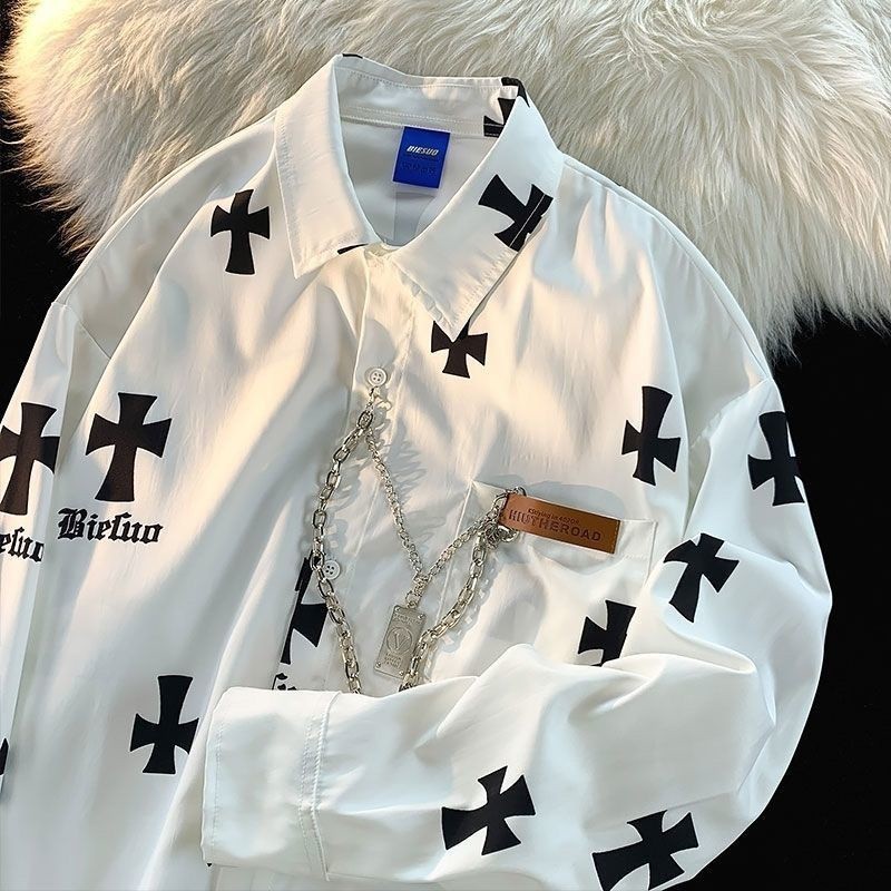 Kemeja Lengan Panjang Motif Salib Jalanan Amerika untuk Pria/Hip-Hop Mantel Pasangan Longgar Rantai