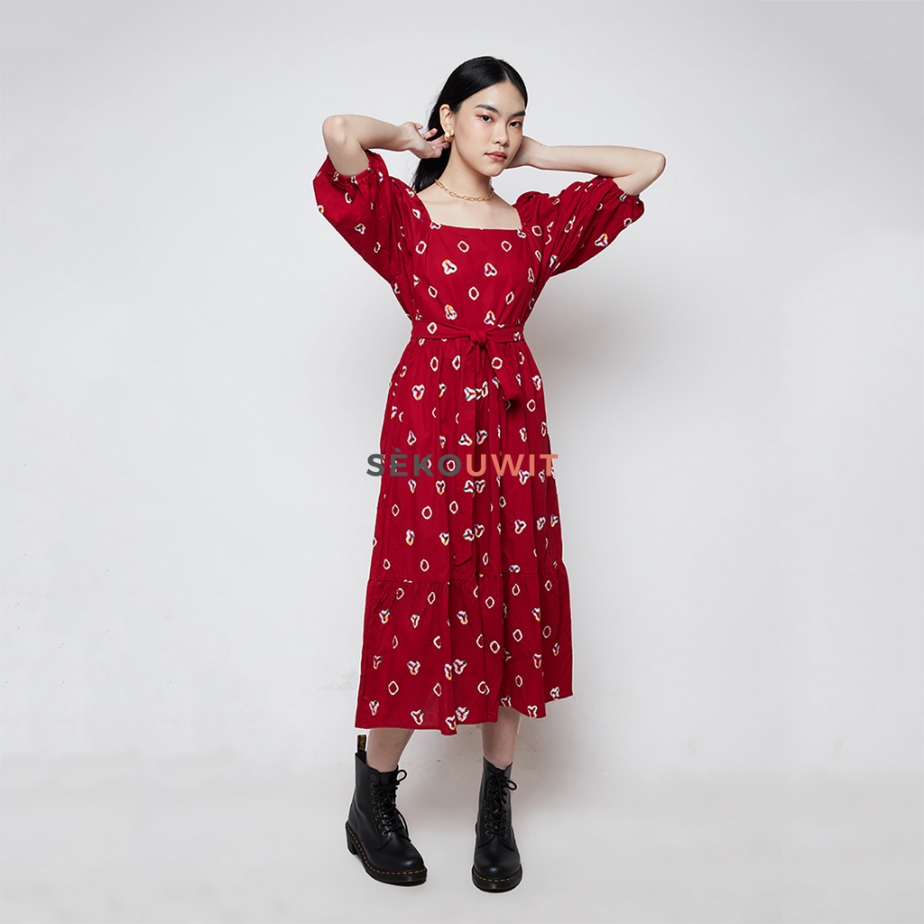 Eri Jumputan Ruffles Midi Dress / Dress Kerut Batik Merah Sekouwit