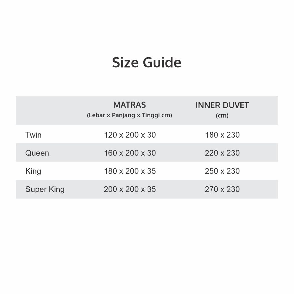 TWIN - 180x230, QUEEN - 220x230, KING - 250x230, SUPER KING - 270x230