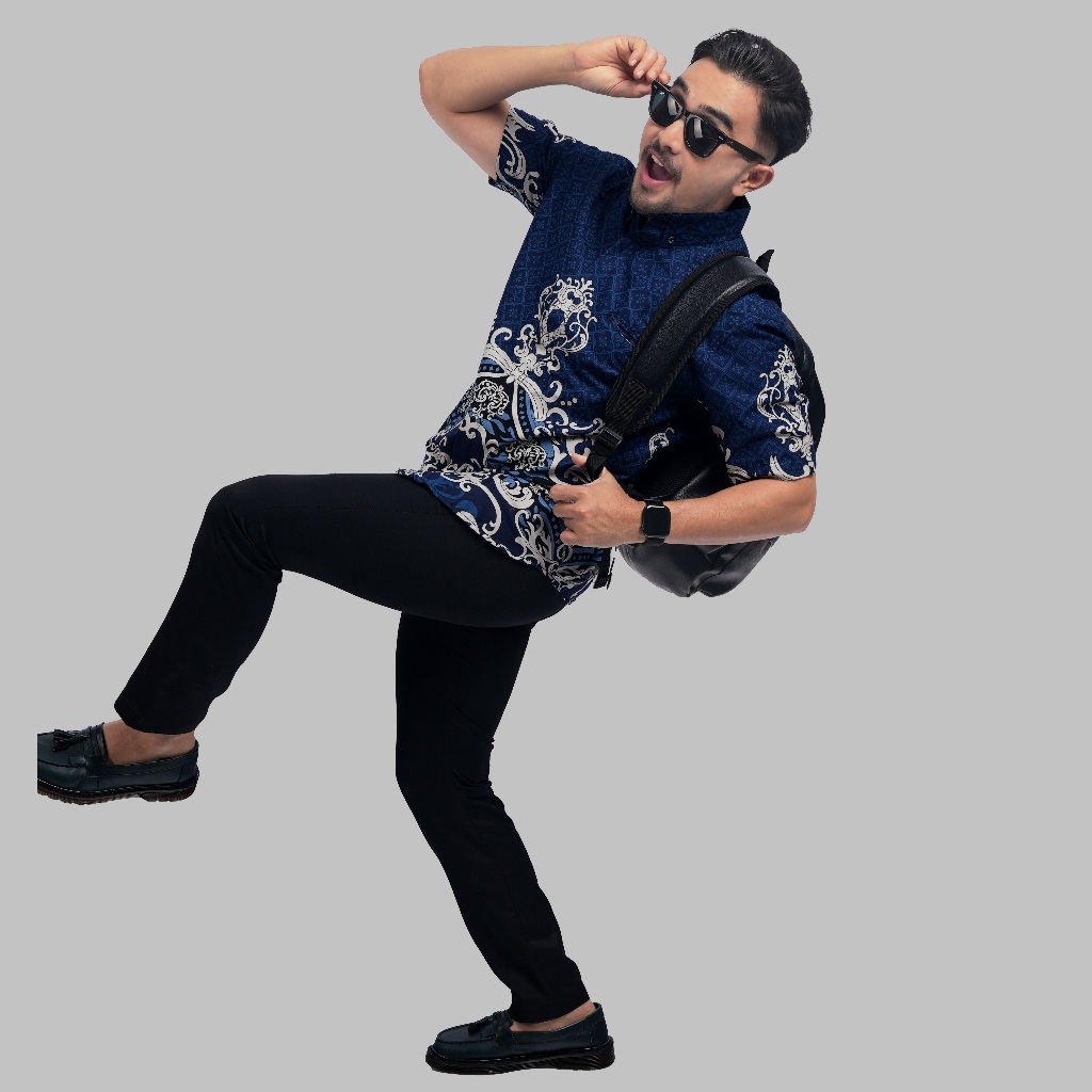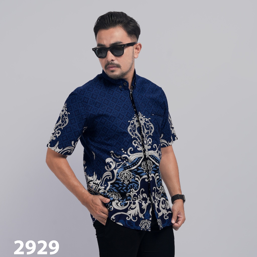 PAKAJI Kemeja Batik Pria Slim Fit Lengan Pendek Lapis Puring Premium Batik Furing Sido Mukti Kawung Panel Navy 2929