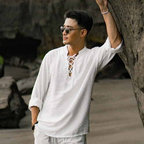 BEACHWELL Kemeja Atasan Pria Linen Kerah Bertali Putih Hitam Polos Premium Lengan Panjang Kasual - Polo Rope