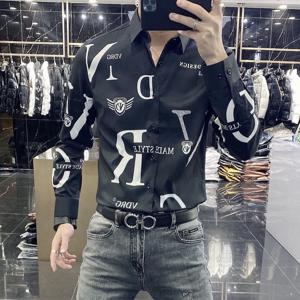 Baju Lengan Panjang untuk Pria, Baju Lengan Panjang Gaya Korea Slim-Fit Trendi, Kemeja Putih Bercetak Unik Modis untuk Pria