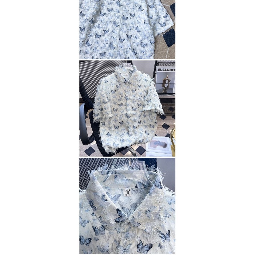 Thin Butterfly Short-Sleeved Shirt Men's Frayed Trendy Hong Kong Style Shirt