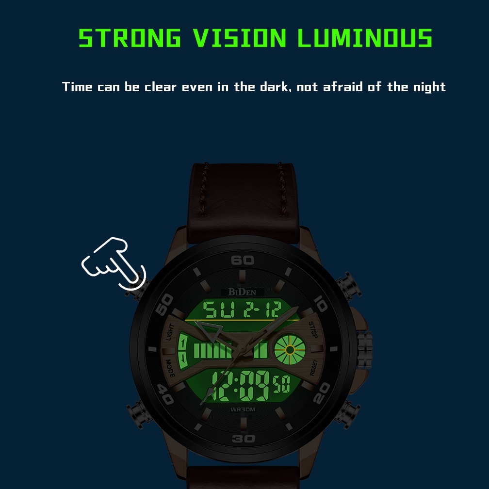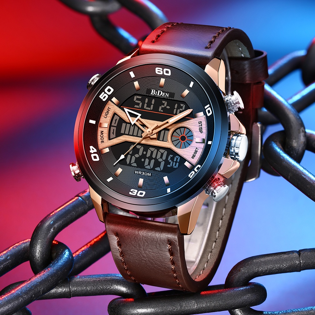 BIDEN Jam Tangan Pria Olahraga Anti Air Jam Analog&Digital Tali Kulit Minggu/Tanggal/Waktu Ganda Dial Jam Tangan Cowok O