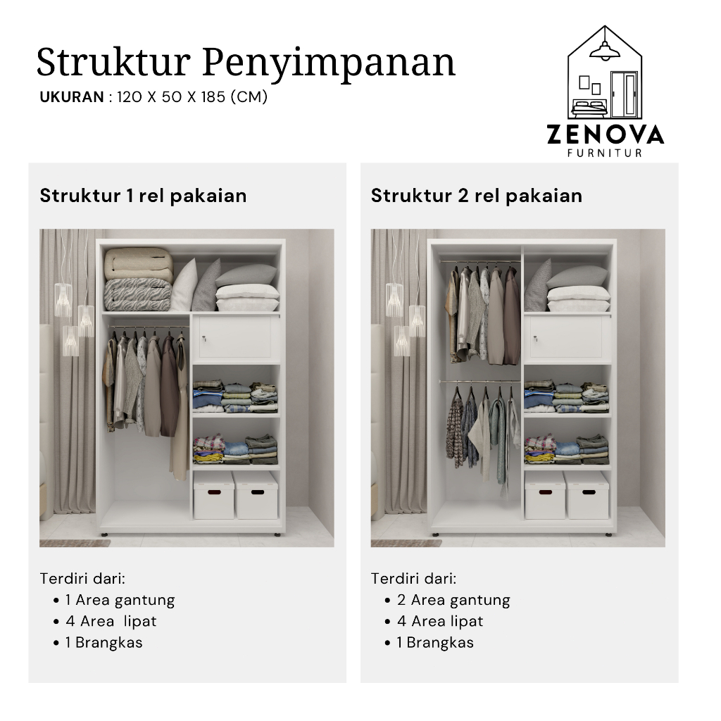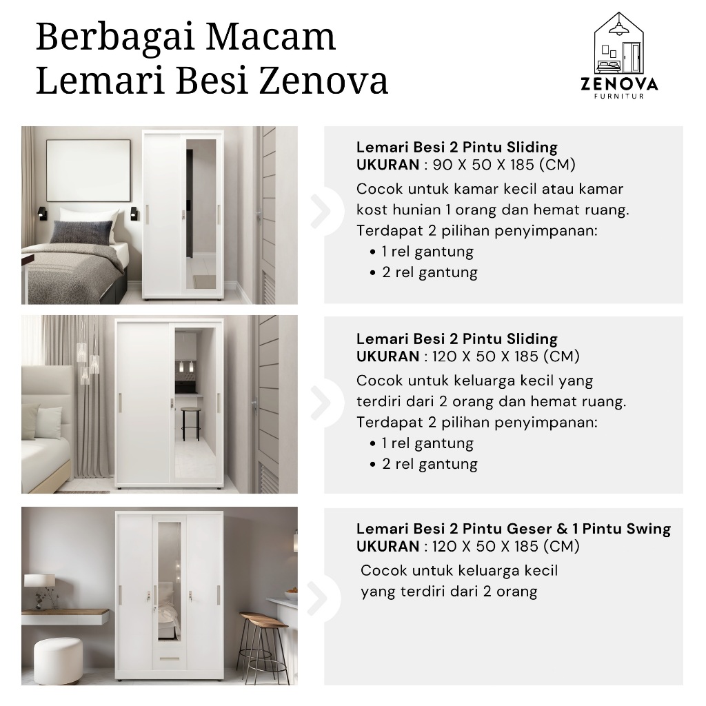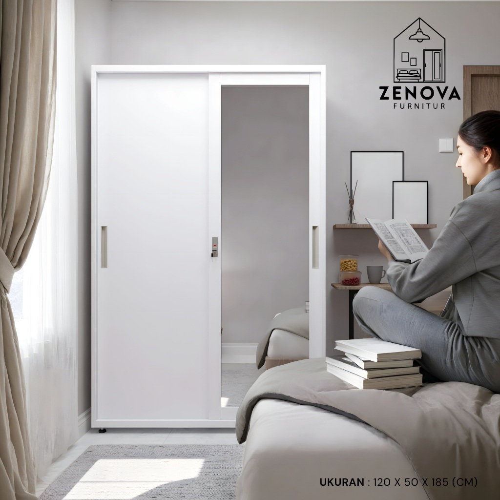 ZENOVA Official Lemari Pakaian Besi Lemari Pakaian slidding 120cm 2 pintu 1 Hanger Cermin Minimalis