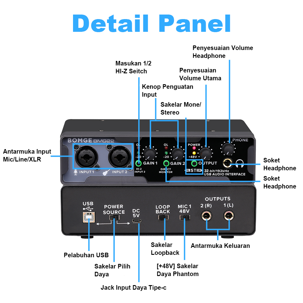 BOMGE BMG-22 Audio Interface USB 2 Saluran - 32Bit/192kHz, Daya Hantu 48V, Direct Monitor, untuk Podcast & Rekaman Musik