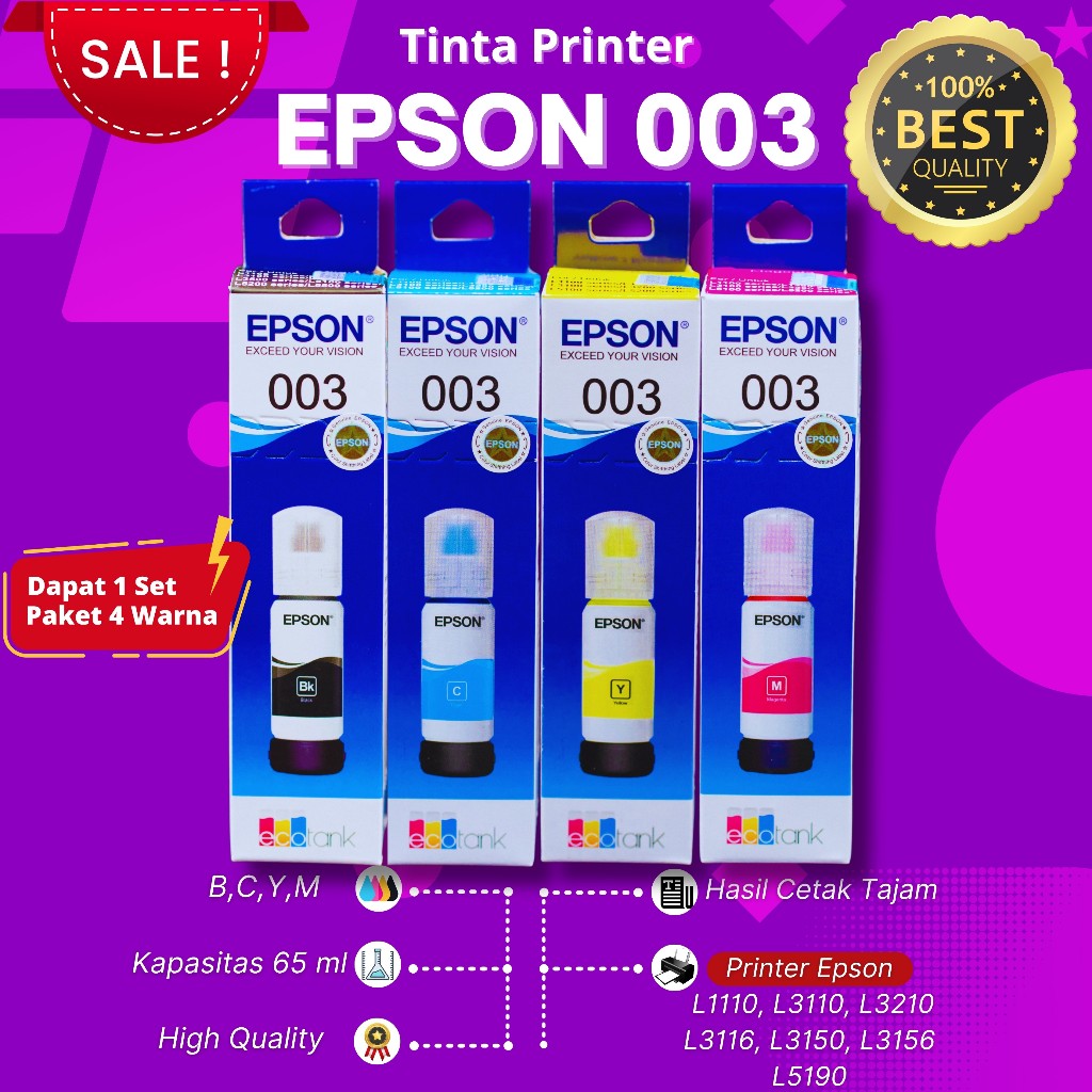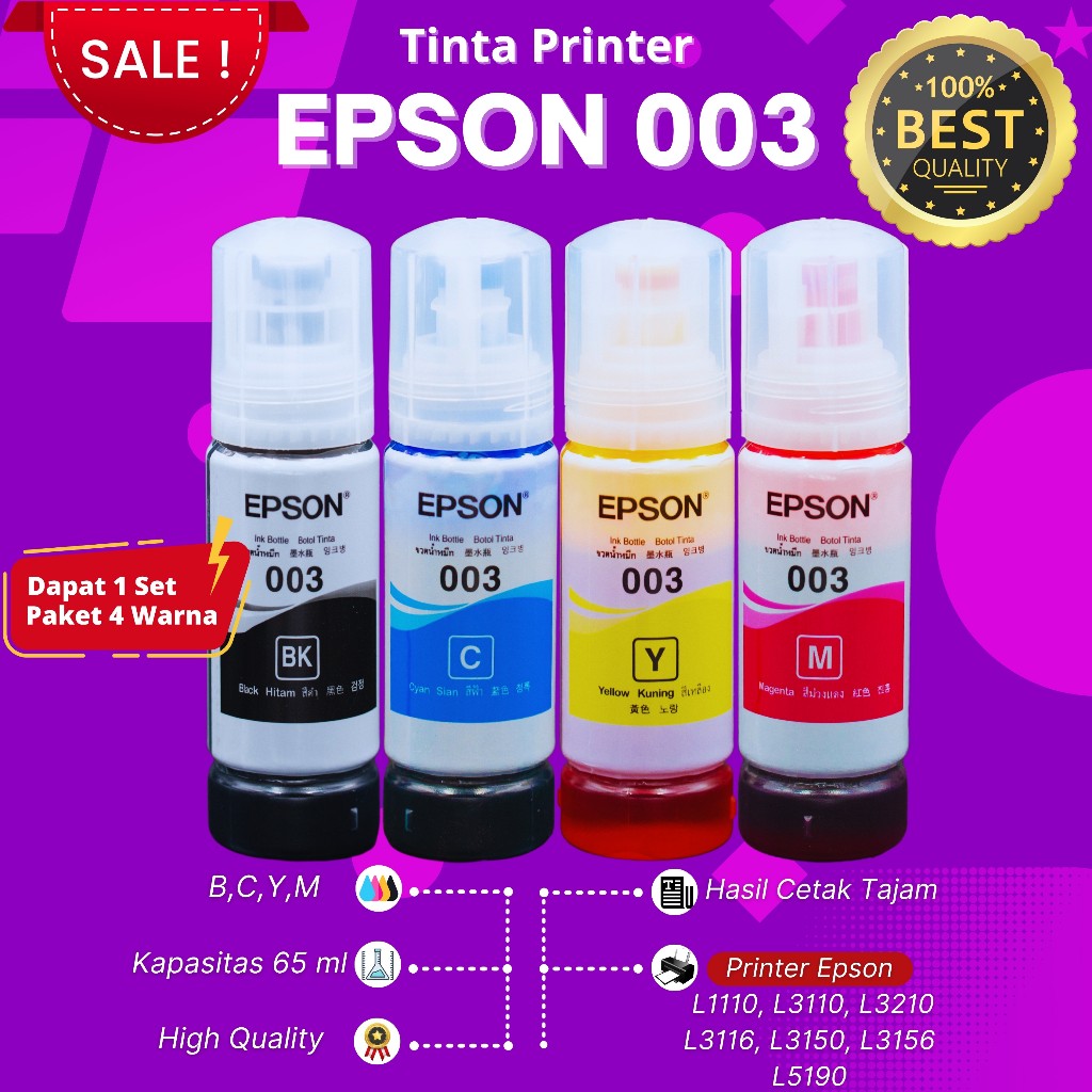 TINTA EPSON 003 ( 1Set ) PREMIUM Printer Series L3210, L1250, L1216, L3250, L3216, L3550, L3256, L1256, L5290, L5296, L5590, L1210, L1110, L3110, L3116, L3150, L3156, L5190