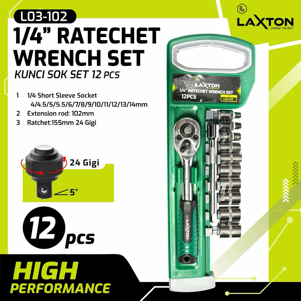 Kunci Sok Set 12 Pcs Laxton L03-102 1/4 Inch | Ratchet 24 Gigi High Performance Perkakas Mobil Motor Rumah