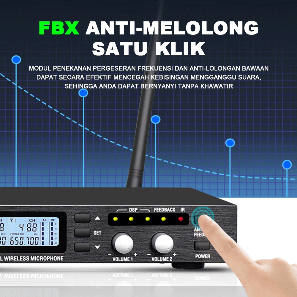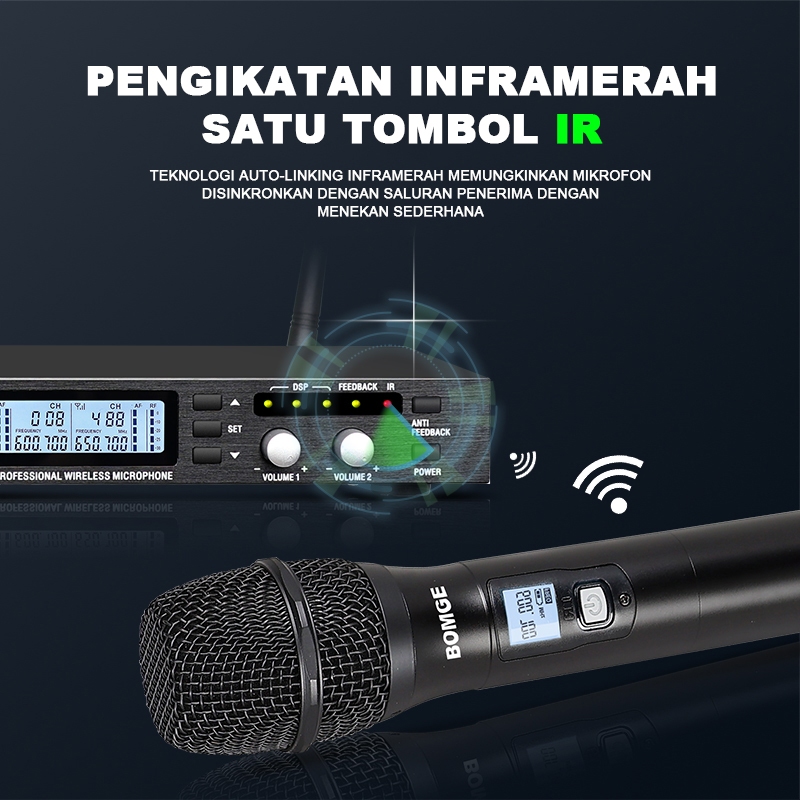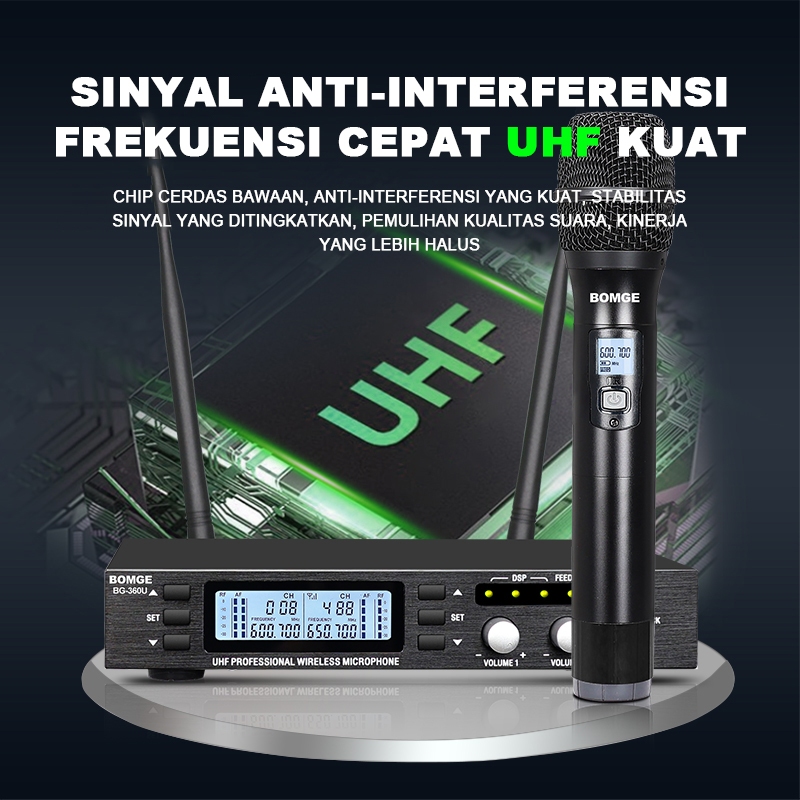 BOMGE 360U Sistem Mikrofon Nirkabel 2 Saluran UHF Pro 600 MHz 480 Channel Antigangguan Logam Penuh DSP 3 Level Anti Feed