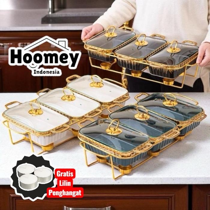 Hoomey Tempat Prasmanan Gandeng 3 Keramik (1L) | Gold Rak Besi Wadah Makan Emas Aesthetic - BLACK GOLD